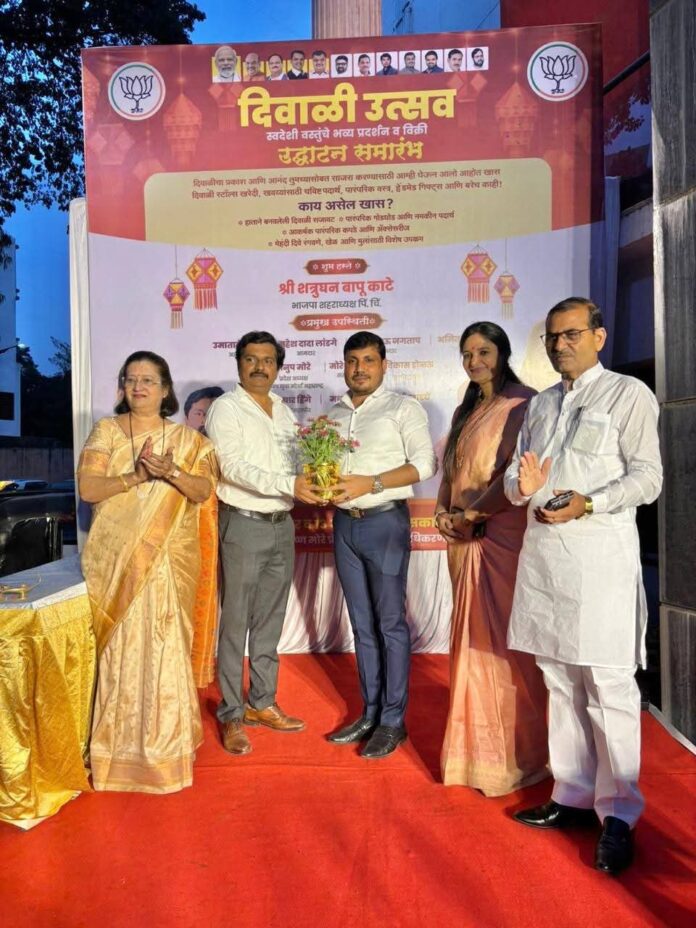 देशाचे पंतप्रधान नरेंद्र मोदी यांनी स्वदेशीचा नारा दिला, स्वदेशी वस्तू खरेदी करण्यासाठी भारतीयांना प्रेरित केले, या पार्श्वभूमीवर पिंपरी चिंचवड शहरात यंदाच्या दिवाळी करिता नागरिकांनी स्वदेशी वस्तू खरेदी कराव्या असा संदेश शहर भाजप वतीने देण्यात येत आहे, त्याचाच एक भाग म्हणून भारतीय जनता पक्षाचे प्राधिकरण चिंचवड मंडळ अध्यक्ष जयदीप खापरे व महिला मोर्चा प्राधिकरण चिंचवड मंडल च्या अध्यक्ष नीताताई कुशारे यांच्या पुढाकाराने दिवाळी उत्सव स्वदेशी वस्तूंची विक्री व प्रदर्शन आयोजित करण्यात आले. या उपक्रमाचे उद्घाटन पिंपरी चिंचवड शहरातील भाजपचे शहराध्यक्ष शत्रुघ्नकाटे यांच्या हस्ते संपन्न झाले यावेळी विधान परिषदेच्या आमदार उमाताई खापरे,सदाशिव खाडे, वैशाली खाडे, मधुकर बच्चे, सीमा चव्हाण, मोरेश्वर शेडगे यांच्या सह भाजपचे अनेक पदाधिकारी कार्यकर्ते मोठ्या संख्येने उपस्थित होते.