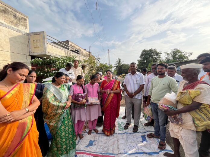 मोशी- मराठवाड्यासह सोलापूर जिल्ह्यामध्ये पावसाने धूमाकुळ घातला. अनेकांचे संसार, हातातोंडाला आलेली शेतातील पिके, गुरे-ढोरे पूरामध्ये वाहून गेले. बळीराजाला या संकटातून बाहेर करण्यासाठी सर्वत्र प्रयत्न सुरु आहेत. त्यामध्ये पिंपरी-चिंचवड शहरातून राष्ट्रवादीच्या महिला शहराध्यक्षा प्रा. कविता आल्हाट यांनीही पुढाकार घेतला. सोलापूर जिल्ह्यातील दोन गावांना प्रत्यक्षात जाऊन अन्नधान्यासह, साड्या, ऊबदार कपडे, टॉवेल, बिस्कीटांचे वाटप केले. आम्ही तुमच्या सोबत आहोत असा शाब्दिक आधाराही बळीराजाला दिला.