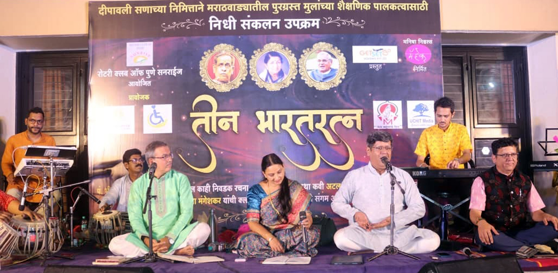 निमित्त होते, मराठवाड्यातील पूरग्रस्त भागातील मुलामुलींसाठी सहाय्यता निधी उभारण्यासाठी आयोजिलेल्या ‘तीन भारतरत्न’, या सांगीतिक मैफलीचे! भारतरत्न पंडित भीमसेन जोशी, गानसम्राज्ञी लता मंगेशकर व कवी अटलबिहारी वाजपेयी यांच्या गाणी, कविता आणि आठवणी असा गोफ या मैफलीच्या माध्यमातून रसिकांनी अनुभवला. गायिका मनीषा निश्चल, गायक अमोल निसळ व संजीव मेहेंदळे यांच्या बहारदार सादरीकरणाने ही मैफल दीर्घकाळ स्मरणात राहील, अशी झाली. मनीष आपटे यांच्या ओघवत्या निवेदनाने मैफलीचा आनंद द्विगुणित झाला.