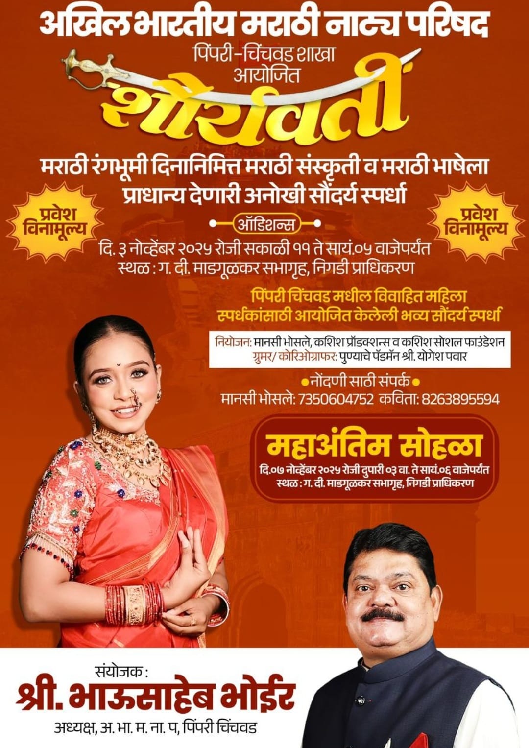 अखिल भारतीय मराठी नाट्य परिषद, पिंपरी-चिंचवड शाखेच्या वतीने आणि कशिश प्रॉडक्शन्स व कशिश सोशल फाउंडेशन मराठी रंगभूमी दिना च्या निमित्ताने विवाहित महिलांसाठी “शौर्यवती” नावाच्या एका खास सांस्कृतिक फॅशन शोचे आयोजन करण्यात आले आहे. या उपक्रमाचा मुख्य उद्देश मराठी भाषेचा अभिमान, छत्रपती शिवाजी महाराजांचे विचार आणि शौर्यवंत मराठी स्त्रीची ओळख समाजासमोर प्रभावीपणे मांडणे हा आहे.