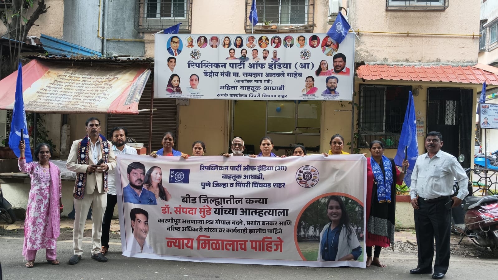 डॉक्टर संपदा मुंडे यांच्या आत्महत्येस कारणीभूत असलेल्या पीएसआय गोपाळ बदने आणि प्रशांत बनकर या शासकीय सेवेतील अधिकाऱ्यांवर कठोर कारवाई व्हावी तसेच त्यांच्यावर फास्टट्रॅक कोर्टात खटला चालवावा या मागणीसाठी रिपब्लिकन पार्टी ऑफ इंडिया आठवले गट महिला वाहतूक आघाडी पिंपरी चिंचवड शहर यांच्या वतीने जाहीर निषेध आंदोलन करण्यात आले हे आंदोलन पिंपरी चिंचवड महिला वाहतूक आघाडी संपर्क कार्यालय, अजमेरा चौक येथे करण्यात आले.