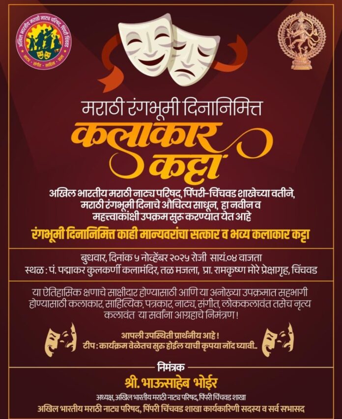 अखिल भारतीय मराठी नाट्य परिषद, पिंपरी-चिंचवड शाखेच्या वतीने मराठी रंगभूमी दिनाचे (५ नोव्हेंबर) औचित्य साधून, शहरातील कलावंतांसाठी एक महत्त्वाकांक्षी आणि नवीन उपक्रम ‘कलाकार कट्टा’ सुरू करण्यात येत आहे. या उपक्रमाचा शुभारंभ आणि रंगभूमी दिनानिमित्त मान्यवरांचा सत्कार समारंभ बुधवार, दिनांक ५ नोव्हेंबर २०२५ रोजी आयोजित करण्यात आला आहे.