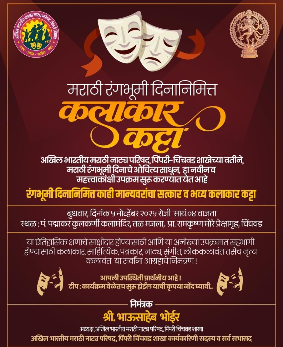 अखिल भारतीय मराठी नाट्य परिषद, पिंपरी-चिंचवड शाखेचे अध्यक्ष भाऊसाहेब भोईर यांनी सर्व क्षेत्रांतील कलाकारांनी या महत्त्वपूर्ण कार्यक्रमास वेळेवर उपस्थित राहावे, असे आवाहन केले आहे.