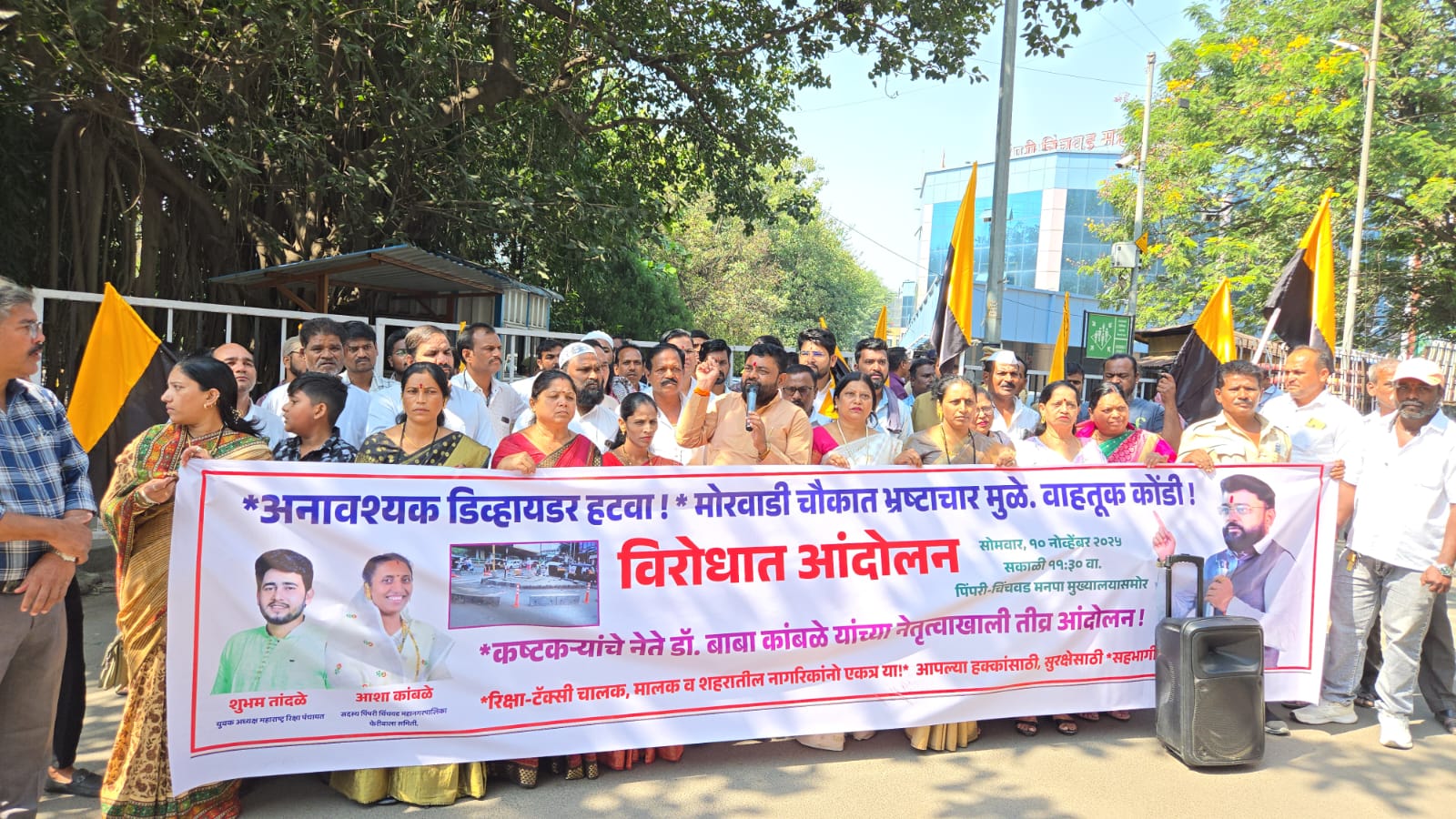 पिंपरी-चिंचवड महानगरपालिकेच्या (PCMC) मोरवाडी चौकातील (अहिल्यादेवी पुतळ्यासमोर) ‘अशास्त्रीय आणि भ्रष्टाचारग्रस्त काँक्रिट डिव्हायडर’ विरोधात आज रिक्षा-टॅक्सी चालकांनी मनपा मुख्यालयासमोर जोरदार शक्तीप्रदर्शन केले. महाराष्ट्र रिक्षा पंचायत कष्टकरी जनता आघाडी व ऑटो टॅक्सी ट्रान्सपोर्ट फेडरेशनचे राष्ट्रीय अध्यक्ष डॉ. बाबा कांबळे यांच्या नेतृत्वाखाली झालेल्या या ‘ठिय्या’ आंदोलनात हजारो रिक्षाचालक, टॅक्सी ड्रायव्हर, दुचाकीस्वार आणि स्थानिक नागरिकांनी सहभाग घेऊन प्रशासनाच्या मनमानी कारभाराला तीव्र विरोध दर्शवला.