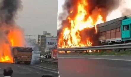 अग्निशामक विभागाच्या गाड्या घटनास्थळी दाखल झाल्या असून आगीवर नियंत्रण मिळविण्याचे काम सुरू आहे. तर अपघाताच्या घटनेमुळे दोन्ही बाजूला लांबच लांब रांगा लागल्या आहेत.
