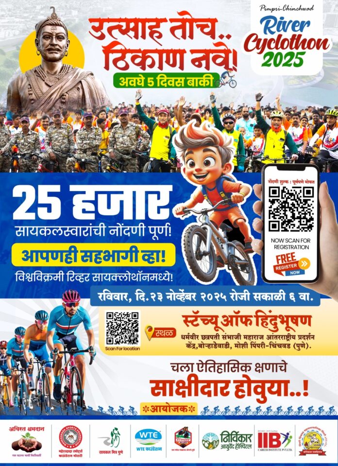 इंद्रायणी नदी स्वच्छतेचा संदेश देणाऱ्या ‘रिव्हर सायक्लोथॉन 2025’ या भव्य उपक्रमाला पुणे- पिंपरी-चिंचवडकरांनी उत्स्फूर्त प्रतिसाद दिला आहे. डुडूळगाव, मोशी येथील ‘स्टॅच्यू ऑफ हिंदुभूषण’ आंतरराष्ट्रीय औद्योगिक प्रदर्शन केंद्र येथे दि. २३ नोव्हेंबर रोजी सकाळी ६ वाजता होणाऱ्या या सायक्लोथॉनसाठी आतापर्यंत २५ हजाराहून अधिक सायकलपटूंची नोंदणी पूर्ण झाली असून, अवघे ५ दिवस शिल्लक असताना आणखी मोठ्या प्रमाणावर नोंदणी वाढण्याची शक्यता आहे, अशी माहिती समन्वयक डॉ. निलेश लोंढे यांनी दिली.