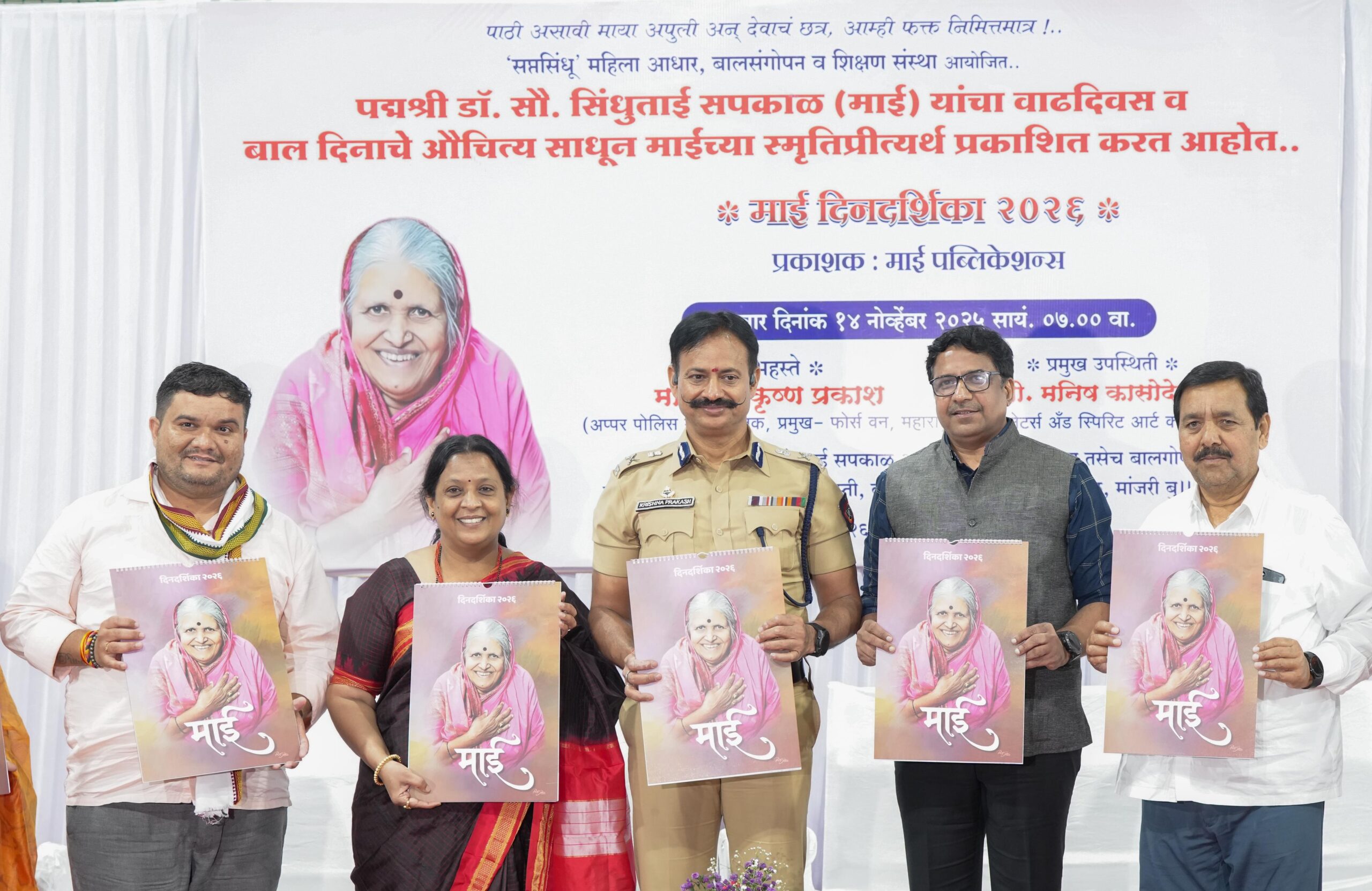 ‘सप्तसिंधू महिला आधार, बालसंगोपन व शिक्षण संस्था, मांजरी तर्फे पद्मश्री डॉ. सौ. सिंधुताई सपकाळ (माई) यांच्या वाढदिवस व बालदिनाच्या औचित्याने ‘माई दिनदर्शिका-2026’ चे प्रकाशन करण्यात आले. यावेळी प्रमुख पाहुणे म्हणून कृष्ण प्रकाश बोलत होते. कार्यक्रमास मनिष कासोदेकर (लेटर्स अँड स्पिरिट आर्ट क्लब), ‘सप्तसिंधू’ महिला आधार, बालसंगोपन व शिक्षण संस्थेच्या अध्यक्षा ममता सिंधुताई सपकाळ, ममता बाल सदनचे अध्यक्ष दीपक दादा गायकवाड, दि मदर ग्लोबलचे अध्यक्ष विनय सपकाळ आणि विविध क्षेत्रातील मान्यवर उपस्थित होते.