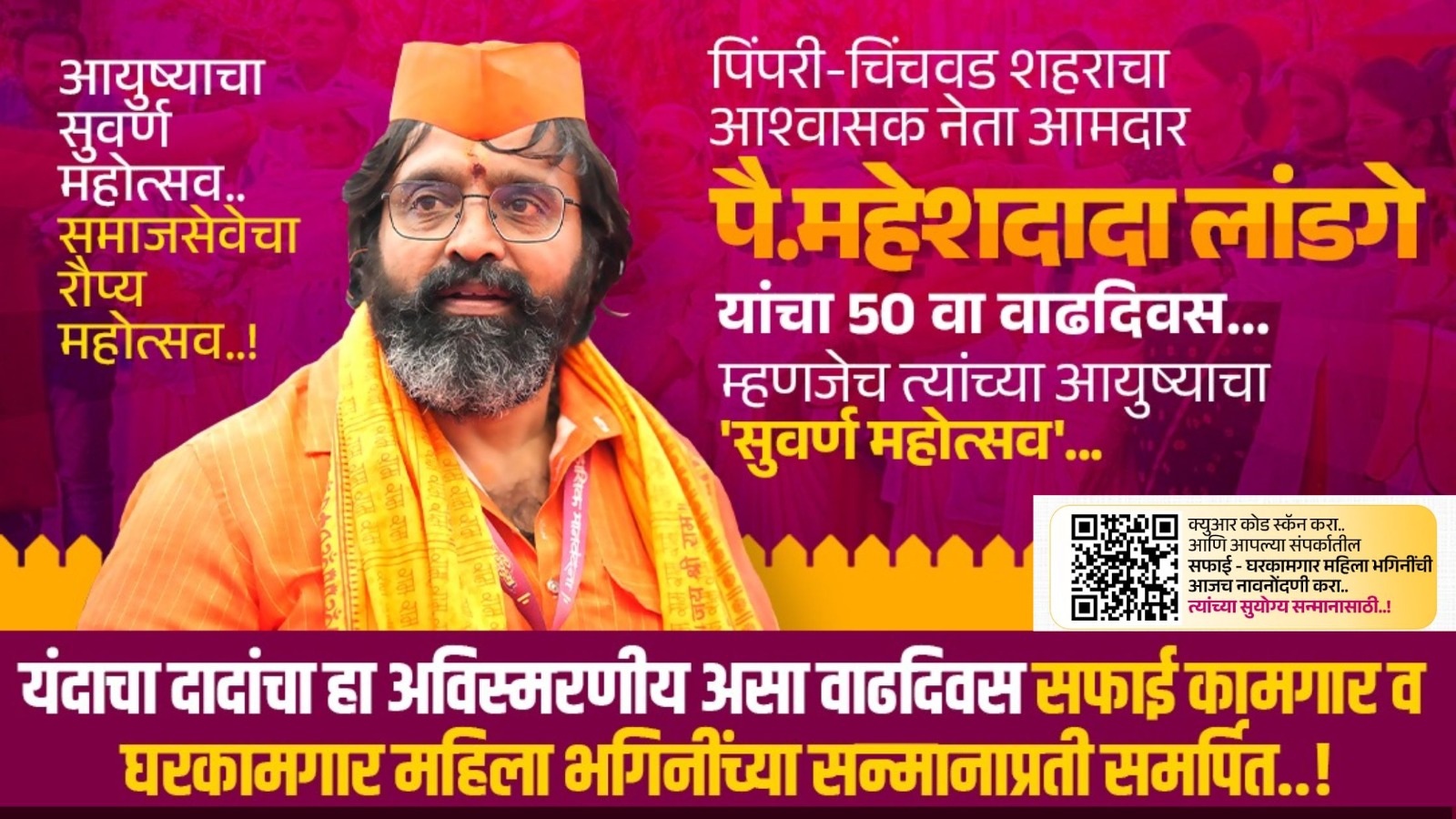 आमदार महेश लांडगे यांचा वाढदिवस प्रतिवर्षी मोठ्या उत्साहात साजरा केला जातो. यावर्षी तब्बल 100 हून अधिक कार्यक्रमांचे आयोजन केले आहे. यामध्ये सांस्कृतिक, आरोग्य विषयक आणि क्रीडा स्पर्धांचा समावेश आहे. आमदार लांडगे यांच्या ‘‘आयुष्याचा सुवर्णमहोत्सव आणि समाजसेवेचा रौप्य महोत्सव’’ असा योग जुळून आला असून, विधायक उपक्रमांनी हा आनंदोत्सव साजरा केला जात आहे. दि. 23 नोव्हेंबर ते दि. 30 नोव्हेंबर 2025 दरम्यान, प्रत्येक कार्यक्रमस्थळी सफाई व घर कामगार माता-भगिनींचा यथोचित सन्मान करण्यात येणार आहे.