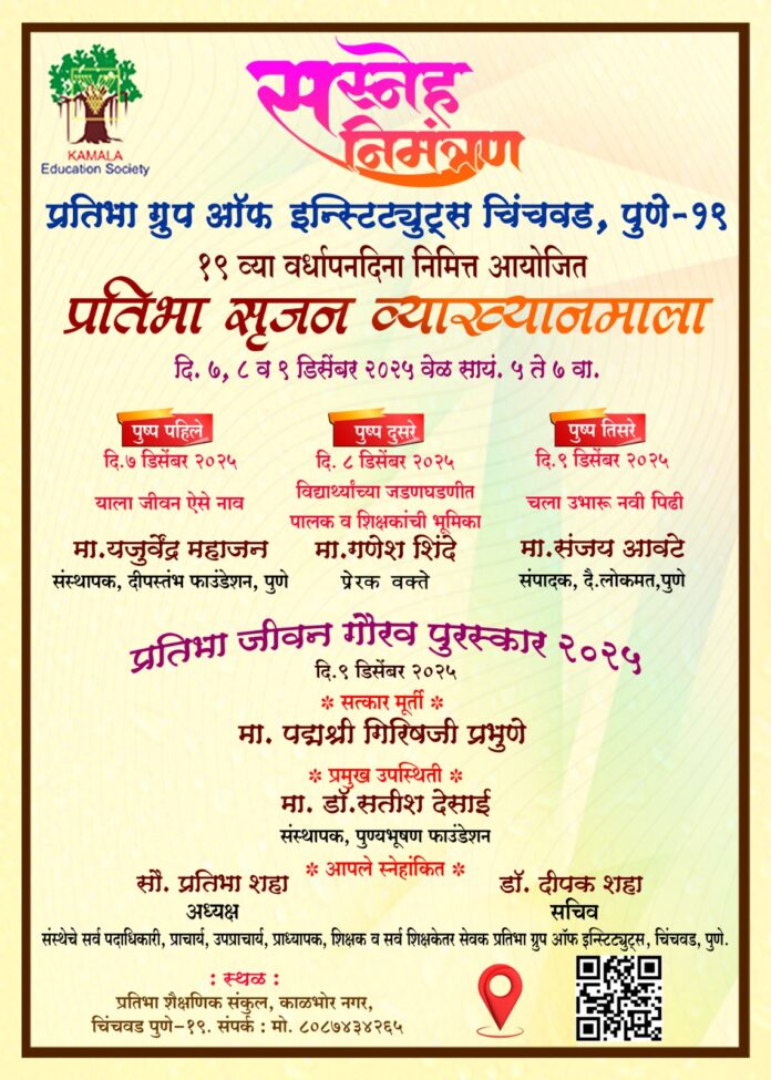 प्रतिभा ग्रुप ऑफ इन्स्टिटयूट्स, चिंचवड यांच्या वतीने संस्थेच्या 19 व्या वर्धापनदिनाचे औचित्य साधत तीन दिवसीय “ प्रतिभा सृजन व्याख्यानमाला -2025” दिनांक सात ते नऊ डिसेंबर या कालावधीत संध्याकाळी पाच ते सात वाजता चिंचवड येथील प्रतिभा महाविद्यालयाच्या प्रागंणात आयोजित केली आहे. विविध क्षेत्रातील मान्यवर तज्ज्ञ, विचारवंत, उद्योगपती, कला व साहित्य क्षेत्रातील अग्रणी व्यक्तींची व्याख्याने या व्याख्यानमालेतून विद्यार्थी, पालक व शिक्षक यांना प्रेरणा देणार आहेत.