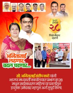 प्रभाग क्रमांक 28 च्या सर्वांगीण विकासासाठी आपण निवडणूक लढविणार असल्याचे सौ अनिता संदीप काटे यांनी सांगितले आहे तसेच शहर भाजपचे पक्षश्रेष्ठी नक्कीच आपल्याला प्रभाग क्रमांक 28 मधून निवडणूक लढविण्यासाठी उमेदवारी देतील, असा विश्वास त्यांनी व्यक्त केला आहे.