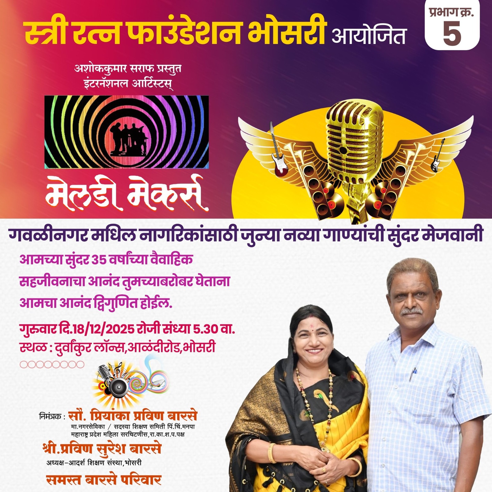 स्त्री रत्न फाउंडेशन भोसरी यांच्या वतीने ‘मेलडी मेकर्स’ या विशेष संगीत मैफिलीचे आयोजन करण्यात आले आहे. अशोककुमार सराफ प्रस्तुत इंटरनॅशनल आर्टिस्ट्स यांच्या सादरीकरणातून गवळीनगर व परिसरातील नागरिकांसाठी जुन्या-नव्या गाण्यांची सुंदर मेजवानी या कार्यक्रमात अनुभवता येणार आहे. माजी नगरसेविका सौ. प्रियांका प्रविण बारसे आणि श्री. प्रविण सुरेश बारसे यांच्या सुमारे ३५ वर्षांच्या वैवाहिक सहजीवनाचा आनंद रसिकांबरोबर साजरा करण्याच्या निमित्ताने हा सांगीतिक सोहळा आयोजित करण्यात आला असून, गोड आठवणींना उजाळा देणारी गीते सादर केली जाणार आहेत.