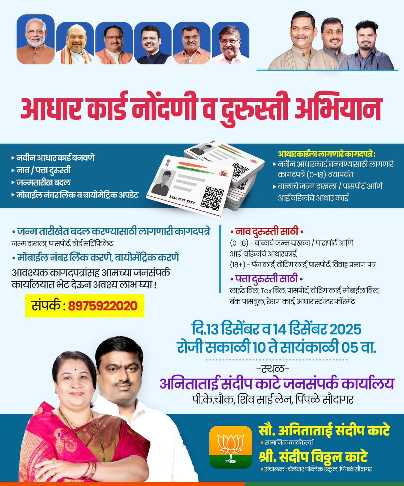 पिंपळे सौदागर : नागरिकांना आधार कार्ड संदर्भातील विविध कामांसाठी होणाऱ्या अडचणी दूर व्हाव्यात, या उद्देशाने सामाजिक कार्यकर्त्या सौ. अनिता संदीप काटे यांच्या पुढाकाराने आधार कार्ड नोंदणी व दुरुस्ती अभियानाचे आयोजन करण्यात आले आहे.