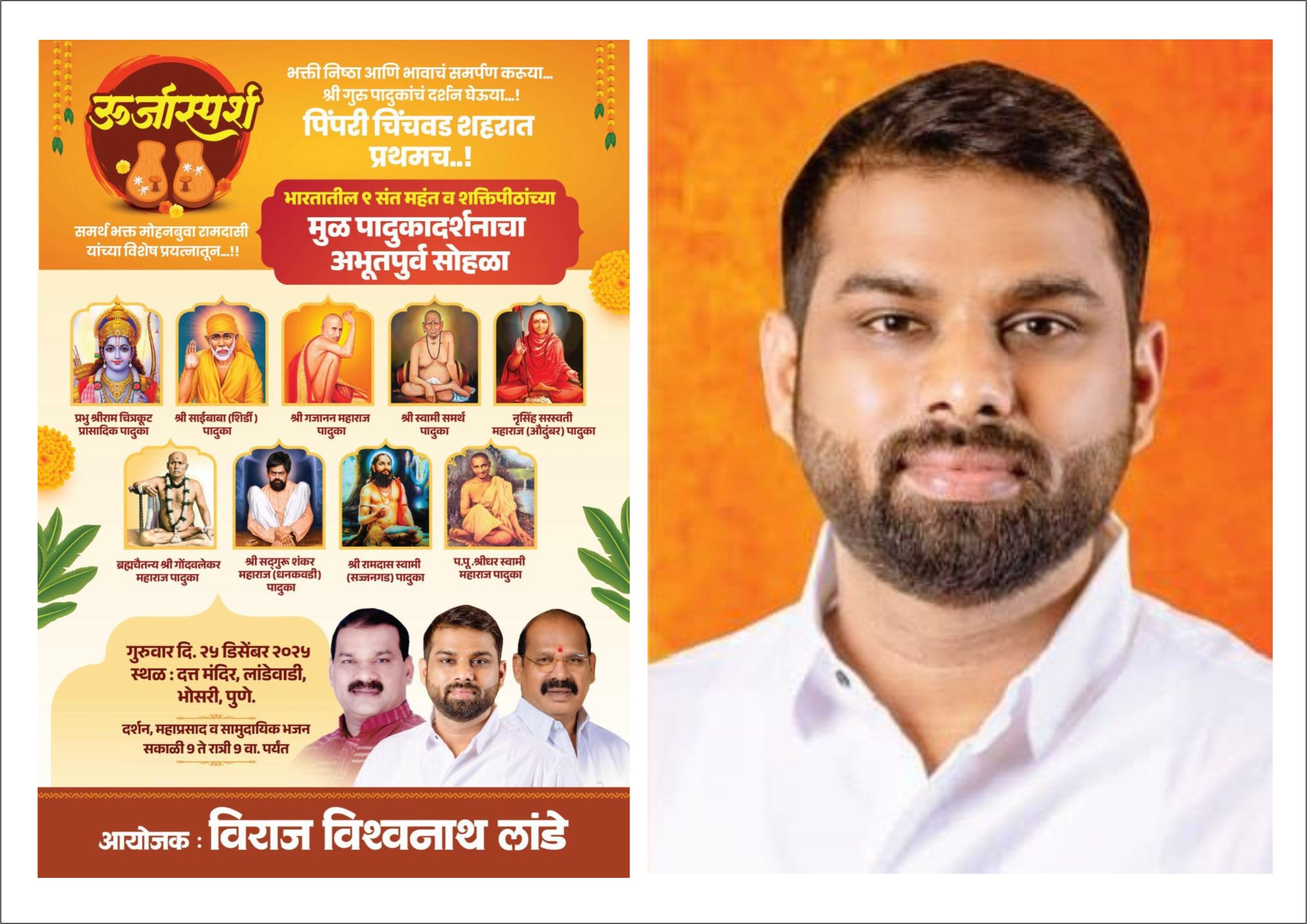 पिंपरी-चिंचवड शहरात प्रथमच भारतातील नामवंत नऊ संत, महंत व शक्तिपीठांच्या मूळ पादुका दर्शनाचा भव्य आध्यात्मिक सोहळा ‘ऊर्जास्पर्श’ आयोजित करण्यात आला आहे. भक्ती, श्रद्धा आणि आध्यात्मिक ऊर्जेचा संगम असलेल्या या सोहळ्याचे आयोजन युवा नेते विराज विश्वनाथ लांडे यांनी केले आहे. भोसरी विधानसभेचे प्रथम आमदार विलास लांडे यांच्या मार्गदर्शनाखाली हा कार्यक्रम होणार आहे.