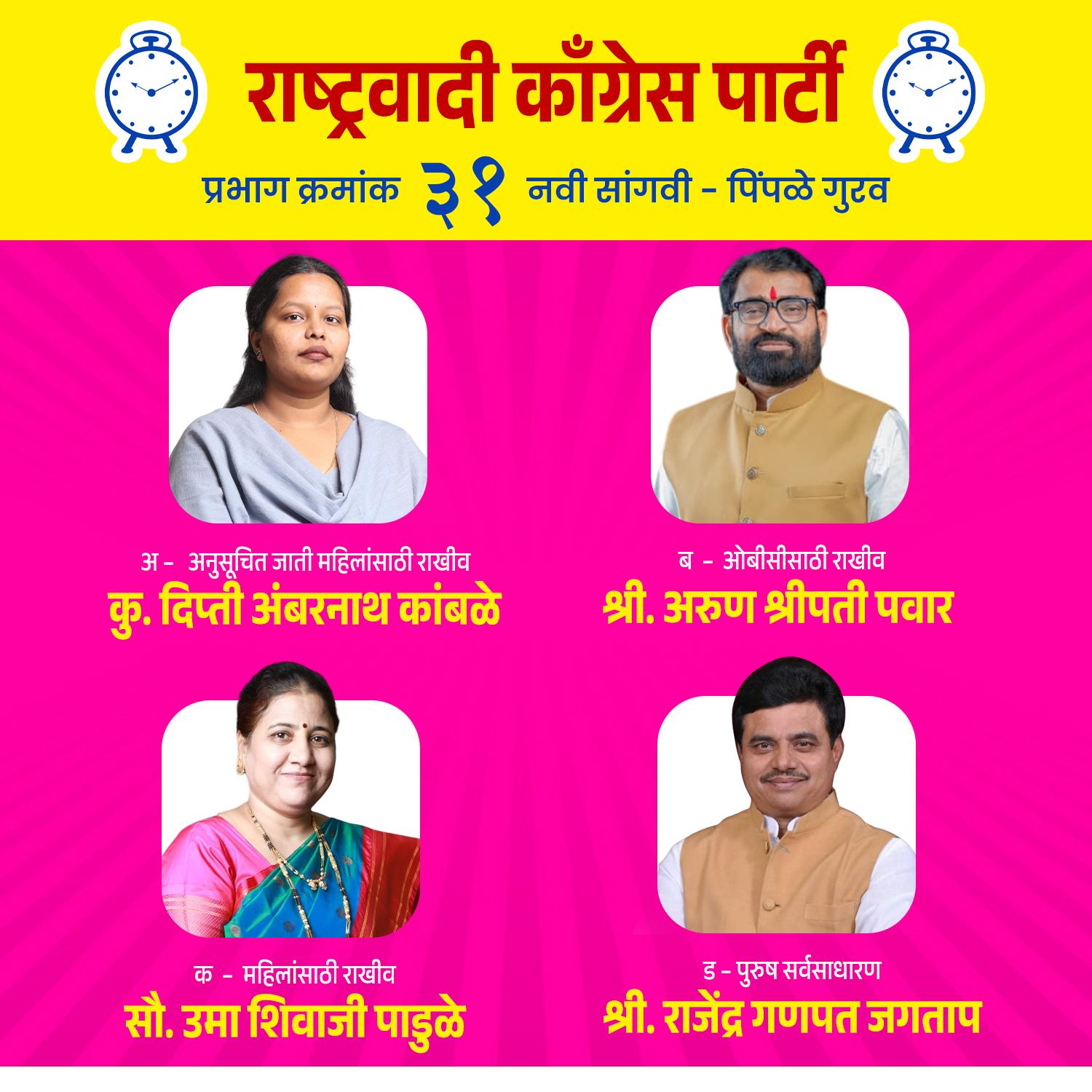 पिंपरी-चिंचवड महापालिका निवडणुकीच्या पार्श्वभूमीवर नवी सांगवी प्रभाग क्र. ३१ मधून राष्ट्रवादी काँग्रेसचे उमेदवार माजी नगरसेवक राजेंद्र जगताप, उद्योजक अरुण पवार, माजी नगरसेवक अंबरनाथ कांबळे यांची कन्या दिप्ती अंबरनाथ कांबळे, माजी नगरसेवक शिवाजी पाडुळे यांच्या पत्नी उमा शिवाजी पाडुळे यांनी सुरू केलेल्या होम-टू-होम प्रचाराला नागरिकांचा उत्स्फूर्त प्रतिसाद मिळत आहे. सकाळपासून संध्याकाळपर्यंत परिसरातील विविध नगरांमध्ये जाऊन त्यांनी थेट मतदारांशी संवाद साधला.