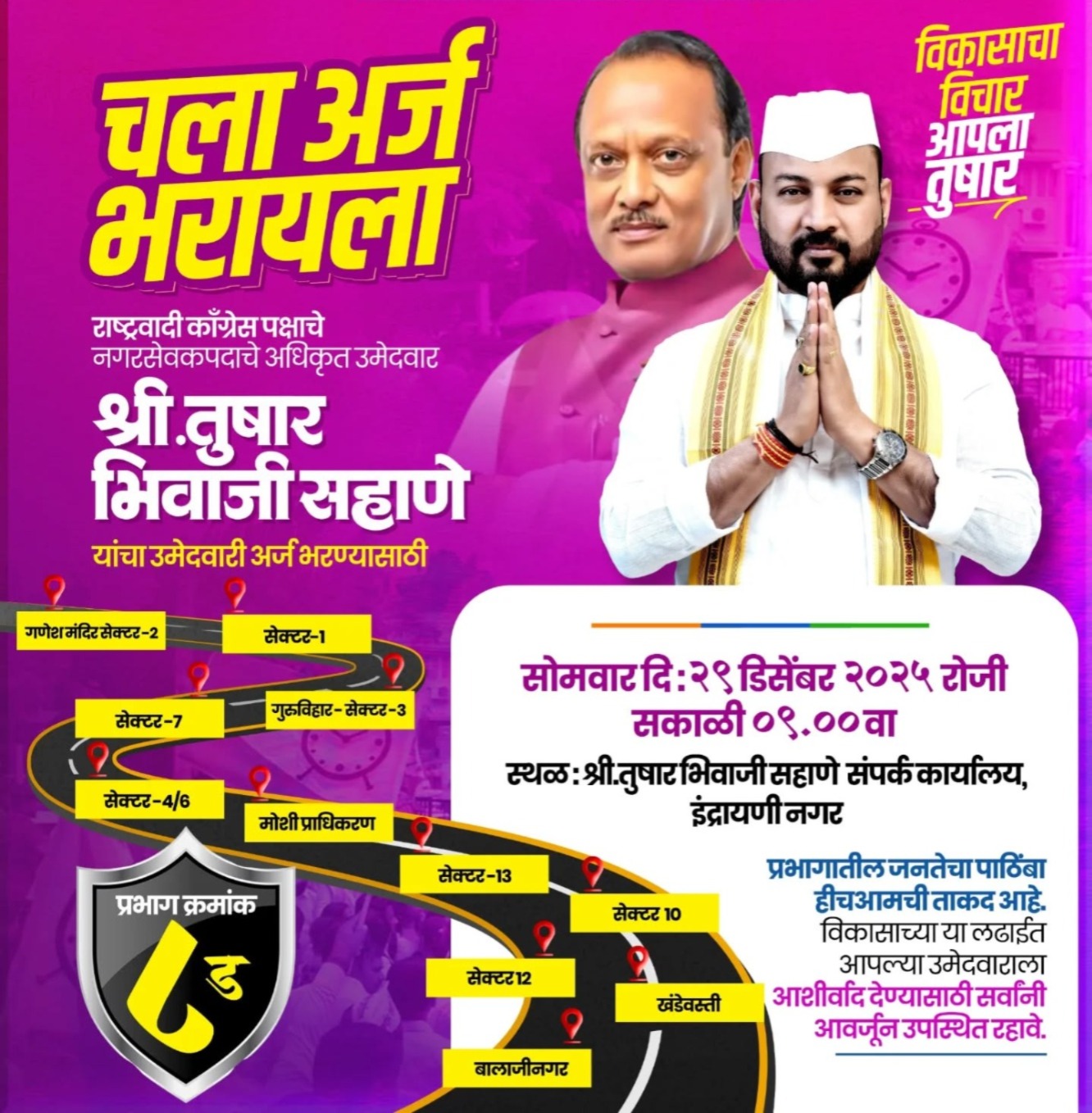 हा कार्यक्रम सोमवार, दिनांक २९ डिसेंबर २०२५ रोजी सकाळी ९.०० वाजता, इंद्रायणी नगर येथील तुषार भिवाजी सहाणे संपर्क कार्यालयात उपस्थित राहण्याचे आवाहन करण्यात आले आहे. या अर्ज भरणी कार्यक्रमासाठी प्रभागातील विविध सेक्टरमधून मोठ्या प्रमाणात कार्यकर्ते, पदाधिकारी व नागरिक सहभागी होणार असून, संपूर्ण प्रभागात उत्साहाचे वातावरण निर्माण झाले आहे.