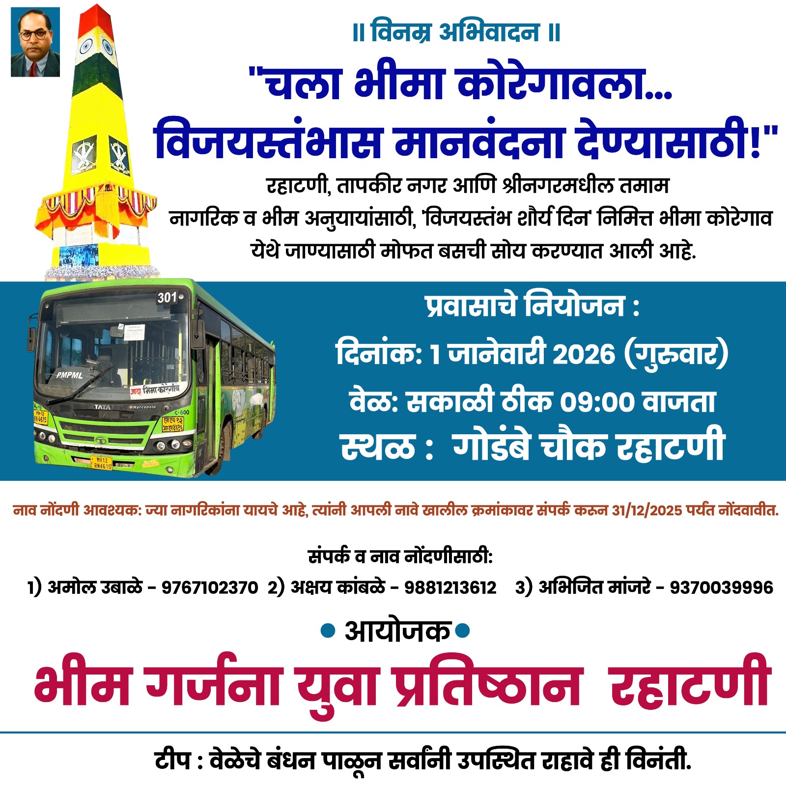 ही मोफत बस सेवा गुरुवार, दिनांक १ जानेवारी २०२६ रोजी सकाळी ठीक ९.०० वाजता निघणार असून, प्रस्थान स्थळ गोडंबे चौक, रहाटणी असेल. विजयस्तंभ शौर्यदिनानिमित्त मोठ्या संख्येने नागरिकांना, युवकांना व भीम अनुयायांना सहभागी होता यावे, या उद्देशाने हा उपक्रम राबवण्यात येत आहे.