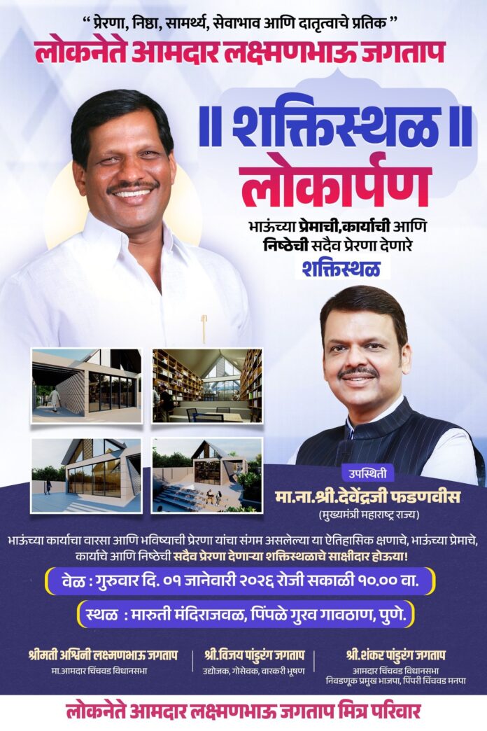 पिंपरी-चिंचवडच्या इतिहासात एक भावनिक व अभिमानाचा क्षण नोंदवला जाणार आहे. प्रेरणा, निष्ठा, सामर्थ्य, सेवाभाव आणि दातृत्वाचे प्रतीक असलेले लोकनेते आमदार लक्ष्मणभाऊ जगताप यांच्या स्मरणार्थ उभारण्यात आलेल्या ‘शक्तिस्थळ’ या प्रेरणा केंद्राचे भव्य लोकार्पण गुरुवार, दि. १ जानेवारी २०२६ रोजी सकाळी १० वाजता पिंपळे गुरव गावठाण येथील मारुती मंदिराजवळ होणार आहे.