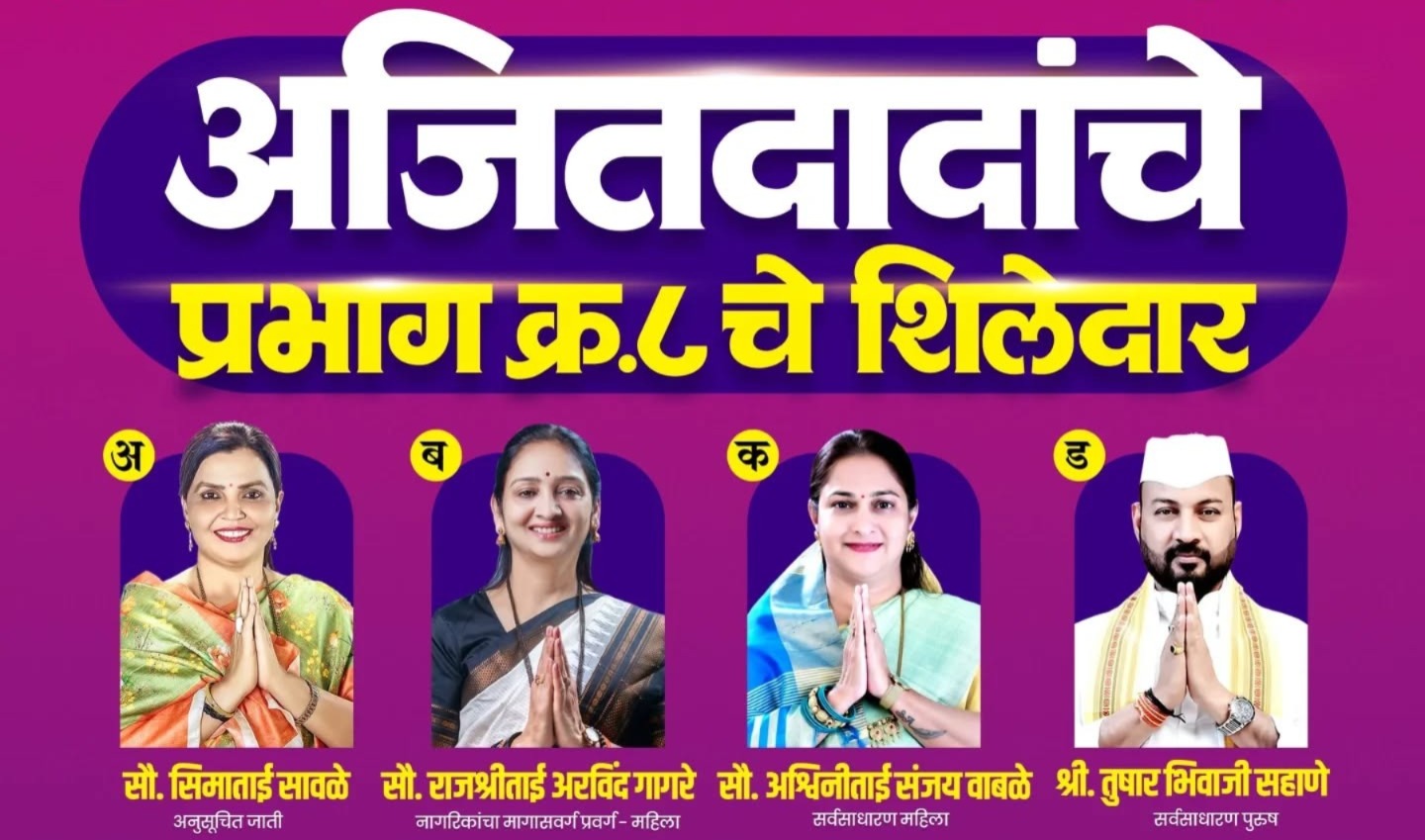 पिंपरी–चिंचवड महानगरपालिका निवडणुकीच्या पार्श्वभूमीवर प्रभाग क्रमांक ८ मधून राष्ट्रवादी काँग्रेस (अजित पवार गट) चे शिलेदार निवडणूक रणांगणात पूर्ण ताकदीने उतरले आहेत. उपमुख्यमंत्री अजित पवार यांच्या नेतृत्वावर विश्वास ठेवत प्रभागातील चारही अधिकृत उमेदवार महापालिका निवडणुकीसाठी सज्ज झाले असून त्यांच्या प्रचाराला मतदारांकडून मोठ्या प्रमाणात प्रतिसाद मिळत आहे.