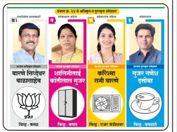 पिंपरी–चिंचवड महानगरपालिका निवडणुकीच्या पार्श्वभूमीवर प्रभाग क्रमांक २४ मधून भारतीय जनता पक्षाच्या वतीने निवडणूक लढविण्याची तयारी करत असलेल्या करिश्मा सनी बारणे, शालिनी कांतीलाल गुजर आणि गणेश दत्तोबा गुजर यांना पक्षाचा एबी फॉर्म वेळेत प्राप्त न झाल्याने अपक्ष म्हणून उमेदवारी अर्ज दाखल करावा लागला होता. आता निवडणूक आयोगाकडून त्यांना अधिकृत निवडणूक चिन्हे प्राप्त झाली असून ते जोमाने निवडणूक लढविण्यास सज्ज झाले आहेत.