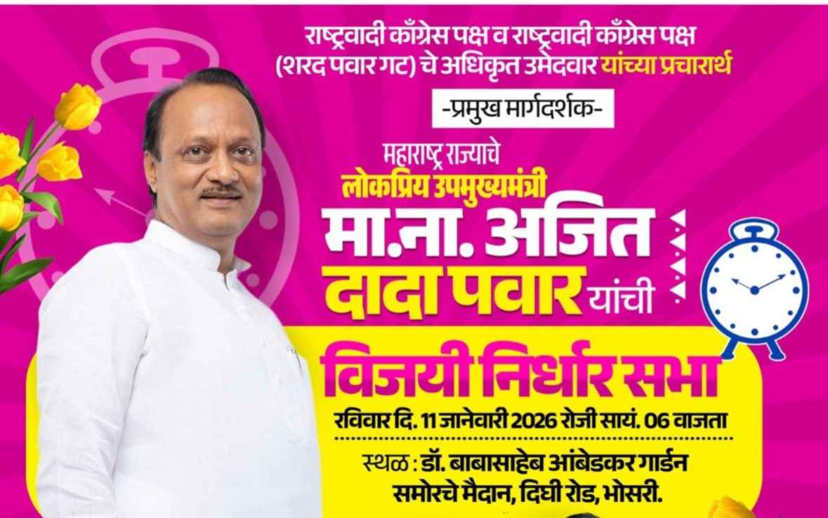 पिंपरी-चिंचवड महानगरपालिका निवडणुकीच्या पार्श्वभूमीवर प्रभाग क्रमांक ५ मधील राष्ट्रवादी काँग्रेस पक्षाच्या उमेदवारांच्या प्रचारार्थ महाराष्ट्र राज्याचे उपमुख्यमंत्री तथा राष्ट्रवादी काँग्रेसचे नेते अजित पवार यांची भव्य विजयी निर्धार सभा आयोजित करण्यात आली आहे. ही सभा रविवार, दिनांक ११ जानेवारी रोजी सायंकाळी ६ वाजता डॉ. बाबासाहेब आंबेडकर गार्डनजवळील मैदान, दिघी रोड, भोसरी येथे संपन्न होणार आहे.