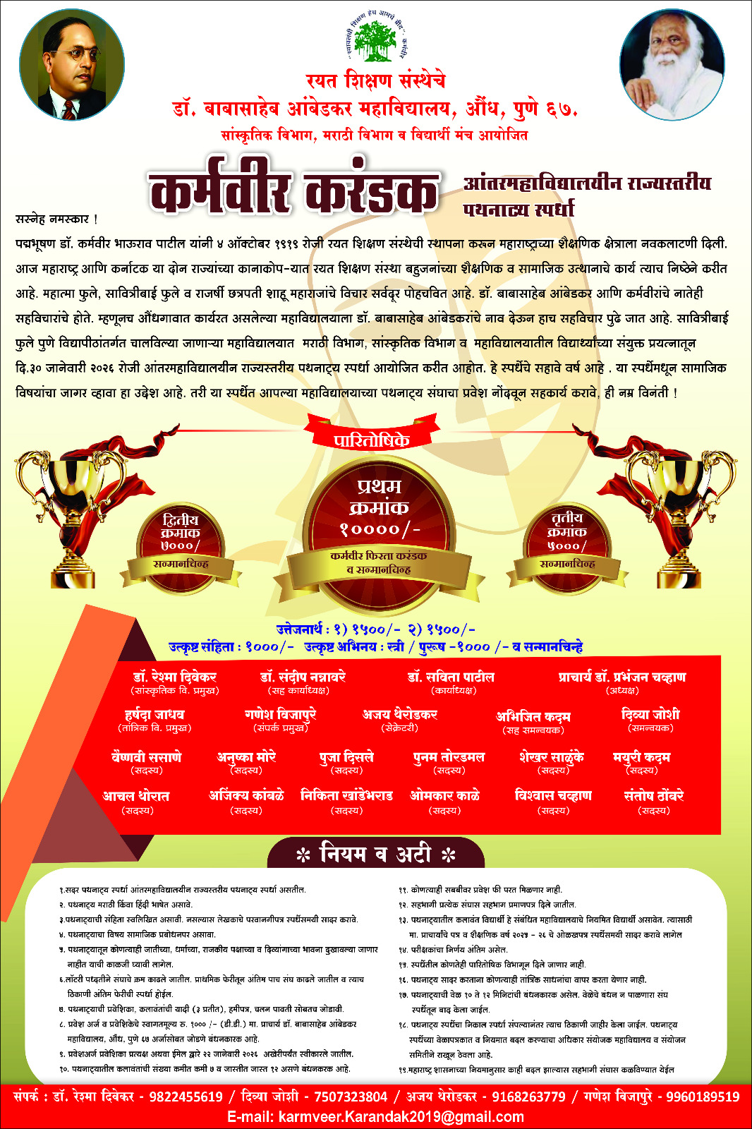 रयत शिक्षण संस्थेचे, डॉ. बाबासाहेब आंबेडकर महाविद्यालय, औंध , सांस्कृतिक विभाग, मराठी विभाग व विद्यार्थी मंच आयोजित कर्मवीर करंडक आंतर महाविद्यालयीन राज्यस्तरीय पथनाट्य स्पर्धा दि. ०६ फेब्रुवारी २०२६ रोजी आयोजित करण्यात आल्या आहेत.हे या स्पर्धेचे सहावे वर्ष आहे. या कार्यक्रमाला उद्घाटक म्हणून मा.दुर्गेश काळे व प्रमुख उपस्थिती मा. प्राचार्य संजय नगरकर- दादा पाटील महाविद्यालय,कर्जत हे उपस्थित राहणार आहे.