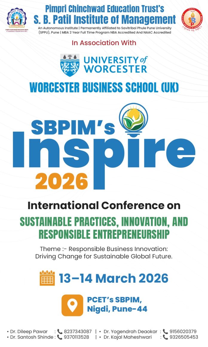 पिंपरी चिंचवड एज्युकेशन ट्रस्ट संचलित एस. बी. पाटील इन्स्टिट्यूट ऑफ मॅनेजमेंट (SBPIM), निगडी यांच्या वतीने “INSPIRE 2026” या दोन दिवसीय आंतरराष्ट्रीय परिषदेचे आयोजन दि. १३ व १४ मार्च २०२६ रोजी करण्यात आले आहे. परिषदेत “Responsible Business Innovation: Driving Change for Sustainable Global Future” या महत्त्वपूर्ण विषयावर देश-विदेशातील संशोधक, प्राध्यापक, उद्योगतज्ज्ञ व विद्यार्थ्यांचा सहभाग राहणार आहे.
