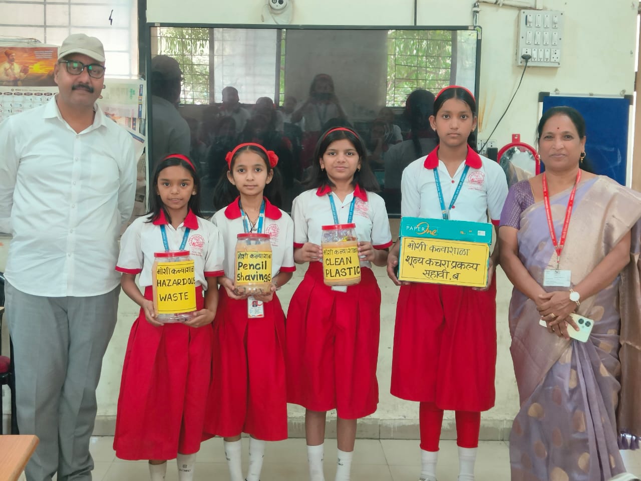 मोशी येथील सावित्रीबाई फुले प्राथमिक कन्या शाळा क्रमांक १०७ येथे इयत्ता सहावी ‘ब’ वर्गामध्ये “शून्य कचरा वर्ग” या अभिनव संकल्पनेवर आधारित नाविन्यपूर्ण उपक्रम प्रभावीपणे राबविण्यात आला आहे. शाळेतील शून्य कचरा प्रकल्पांतर्गत विद्यार्थिनींमध्ये स्वच्छतेची जाणीव आणि जबाबदारीची भावना रुजविण्याचा उद्देशाने हा उपक्रम राबवण्यात आला आहे.