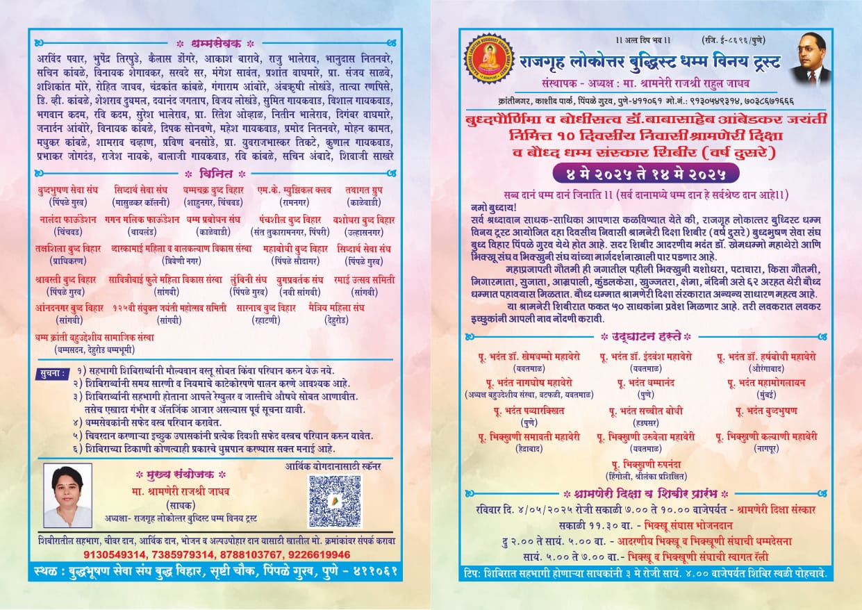 बुद्धभूषण सेवा संघ बुद्ध विहार, पिंपळे गुरव या ठिकाणी आयोजित या शिबिराचे उद्घाटन पूज्य भदंत डॉ. खेमधम्मो महाथेरो यांच्या हस्ते रविवारी, दिनांक 4 मे रोजी या होणार असून शिबिराची सांगता बुधवार, दिनांक 14 मे रोजी दि बुद्धीस्ट सोसायटी ऑफ इंडिया चे आंतरराष्ट्रीय प्रवक्ते डॉ. रोहित पिसाळ यांच्या उपस्थितीत पिंपळे गुरव येथील निळू फुले सभागृहात होणार आहे.