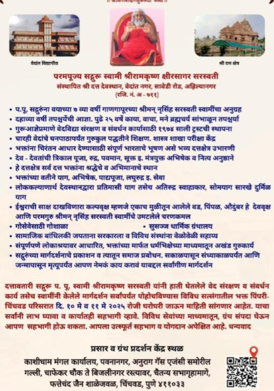 श्रीदत्त देवस्थान, सावेडी, अहिल्यानगर यांच्यावतीने चिंचवडगावातील काशीधाम मंगल कार्यालय येथे दिनांक १० आणि ११ मे २०२५ या कालावधीत धार्मिक ग्रंथप्रदर्शन आणि धार्मिक उपक्रमांचे आयोजन करण्यात आले आहे. शुक्रवारी सायंकाळी ७:०० वाजता श्री गुरुदेवांचे आगमन होईल. शनिवार, दिनांक १० मे रोजी सकाळी ठीक ०७:०० वाजेपासून नामस्मरण, आरती, सेवा सूचना, प्रसारकार्य हे धार्मिक उपक्रम राबविण्यात येतील. याशिवाय स्व. श्रीरामकृष्ण क्षीरसागर स्वामी यांनी सुरू केलेल्या वेदांच्या प्रचारकार्याची माहिती देवस्थानचे कार्यकर्ते घरोघरी जाऊन देणार आहेत. रविवार, दिनांक ११ मे रोजी दुपारी ०३:०० वाजता समारोप होईल. नागरिकांनी ग्रंथ प्रदर्शनास भेट द्यावी तसेच धार्मिक उपक्रमांमध्ये सहभागी व्हावे, असे आवाहन संयोजकांच्या वतीने करण्यात आले आहे.