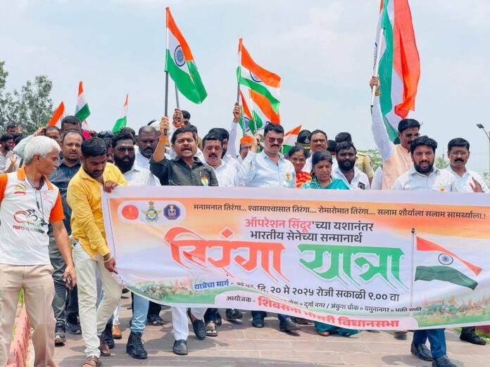 महाराष्ट्राचे उपमुख्यमंत्री एकनाथ शिंदे च्या आदेशानुसार तसेच शिवसेना उपनेते इरफान भाई सय्यद ,जिल्हाप्रमुख भगवानशेठ पोखरकर व भोसरी विधानसभा शहर प्रमुखnसंभाजीराव शिरसाट यांच्या मार्गदर्शनाखाली ऑपरेशन सिंदूरच्या यशानंतर भारतीय सेनेच्या सन्मानार्थ आजपिंपरी चिंचवड शहरातील भोसरी विधानसभा मध्ये भव्य तिरंगा यात्रा काढण्यात आली.सदर तिरंगा यात्रेला मोठ्या उत्साहामध्ये शिवसैनिकांनी,युवकांनी ऑपरेशन सिंदूरच्या ऐतिहासिक विजयाबद्दल सहभाग घेत भारतीय सैन्याचा जय -जयकार केला .