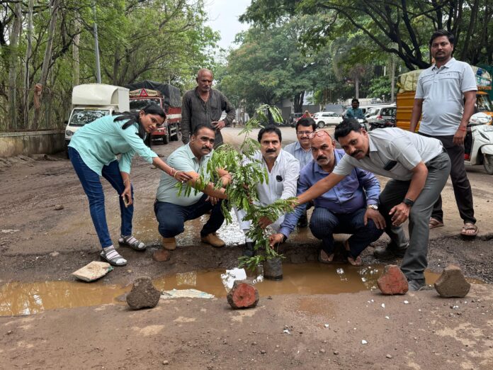 भोसरी एमआयडीसी टी ब्लॉक परिसरात आज फोरम ऑफ स्मॉल स्केल इंडस्ट्रीज असोसिएशन तर्फे महानगरपालिकेला जाग आणण्यासाठी खड्ड्यामध्ये वृक्षारोपण करण्यात आले.