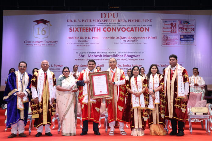 पिंपरी/पुणे, : डॉ. डी. वाय. पाटील विद्यापीठ (डीपीयू ), (अभिमत विद्यापीठ) पिंपरी, पुणे येथे 26 मे 2025 रोजी विद्यापीठाच्या सभागृह्यामध्ये 16 वा पदवीप्रदान समारंभ विद्यापीठाचे कुलपती मा. डॉ. पी. डी. पाटील यांच्या अध्यक्षतेखाली मोठ्या उत्साहात पार पडला.