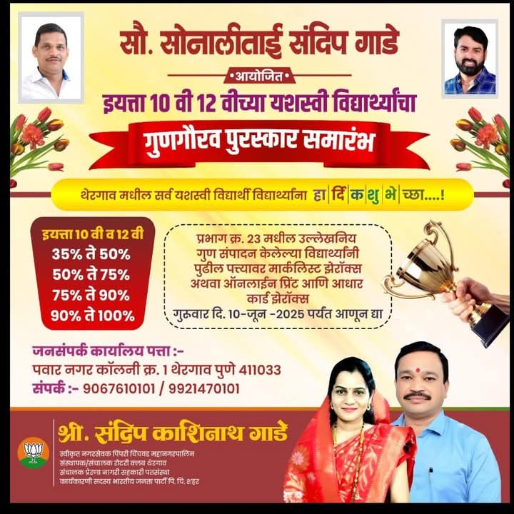 थेरगाव परिसरातील इयत्ता दहावी व बारावी परीक्षेमध्ये उत्तीर्ण झालेल्या विद्यार्थ्यांचा सत्कार समारंभ आयोजित करण्यात आला असून या सत्कार समारंभात सहभागी होण्यासाठी विद्यार्थ्यांनी आपले गुणपत्रक स्वीकृत सदस्य संदीप काशिनाथ गाडे यांचे जनसंपर्क कार्यालय, पवार नगर, कॉलनी क्रमांक एक थेरगाव या ठिकाणी जमा करावे असे आवाहन आयोजकांच्या वतीने करण्यात आले आहे.