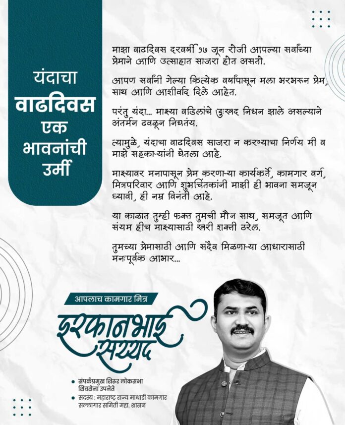 माझ्यावर मनापासून प्रेम करणारे कार्यकर्ते, कामगार वर्ग, मित्र परिवार आणि शुभचिंतकांनी माझी ही भावना समजून घ्यावी, ही नम्र विनंती आहे.