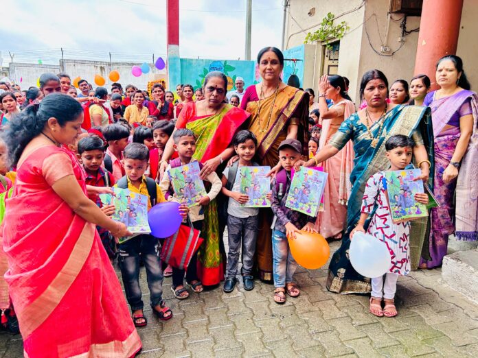यावेळी मुलांना शासनाची मोफत पाठ्यपुस्तके वाटण्यात आली. टाळ्या वाजवून मुलांवर फुले उधळून ,फुगे -खाऊ वाटून जल्लोषात मुलांचे स्वागत झाले.यावेळी विद्यार्थ्यांना शाळेत आल्याचा व आपल्या मित्र-मैत्रिणी भेटल्याचा आनंद चेहऱ्यावरून ओसंडून वहात होता.