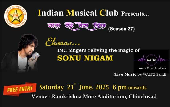 इंडियन म्युझिकल क्लब (आय. एम. सी.) यांच्या वतीने शनिवार, दिनांक २१ जून २०२५ रोजी सायंकाळी ०६:०० ते ०९:३० या कालावधीत प्रा. रामकृष्ण मोरे प्रेक्षागृह, चिंचवड येथे तरुण पिढीचे लोकप्रिय गायक तसेच राष्ट्रीय पुरस्कारासह इतर एकूण ३३ सन्मानांचे मानकरी असलेले सुप्रसिद्ध गायक सोनू निगम यांच्या गीतांची नि:शुल्क मैफल ऐकण्याची संधी उपलब्ध करून देण्यात आली आहे.