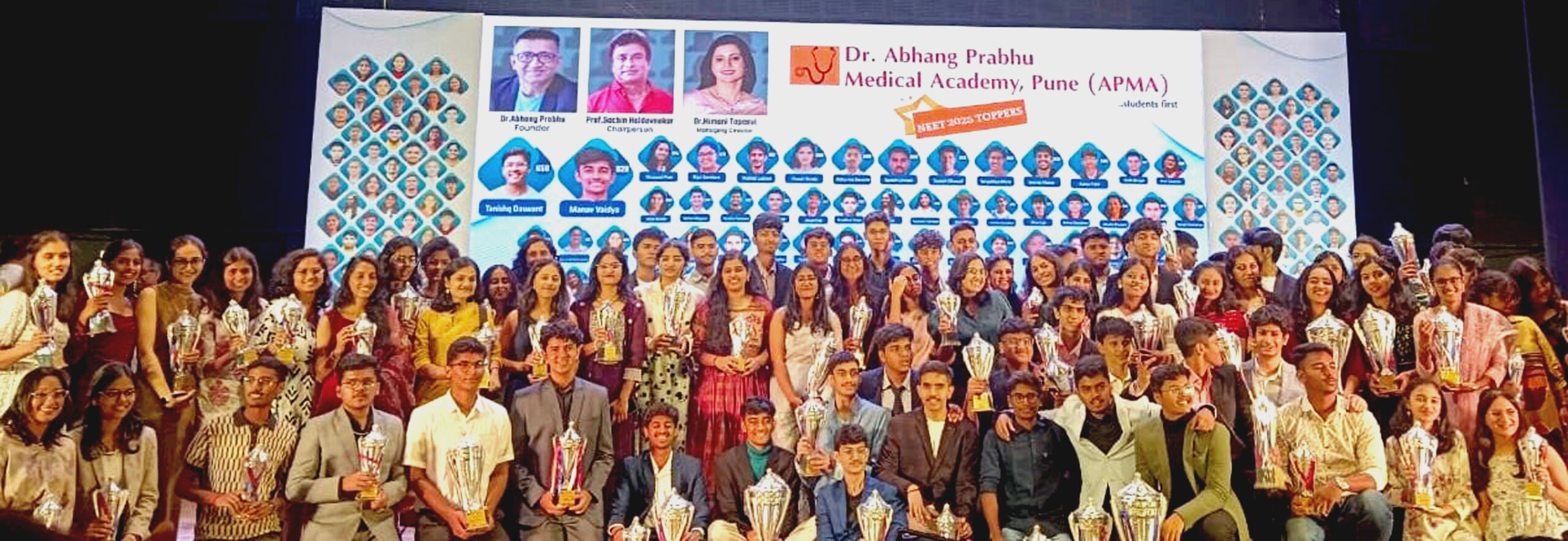 बाणेर येथील बंतारा भवनात आयोजित सोहळ्यात ज्येष्ठ अस्थिरोगतज्ज्ञ डॉ. सचिन तपस्वी, ‘एपीएमए’चे संचालक डॉ. अभंग प्रभू, डॉ. अर्चना प्रभू, डॉ. हिमानी तपस्वी, प्रा. सचिन हळदवणेकर, समुपदेशिका डॉ. शीतल श्रीगिरी आदी उपस्थित होते. ‘एपीएमए’मध्ये मार्गदर्शन घेत गुणवत्ता यादीत आलेल्या तनिष्क दासवंत (देशात ४० वा, गुण ६५८), मानव वैद्य (देशात २७५ वा, गुण ६२८), श्रावणी पोरे (देशात ६५६ वी, गुण ६१४), रीजुल सांबरे (देशात ७०१ वी, गुण ६१२), तर निषाद लुब्री (देशात ७८० वा, गुण ६१०) या गुणवंतांचा विशेष सन्मान करण्यात आला. प्रसंगी बायोलॉजी विषयात देशात प्रथम आलेल्या रीजुल सांबरे हिचा विशेष सन्मान करण्यात आला.