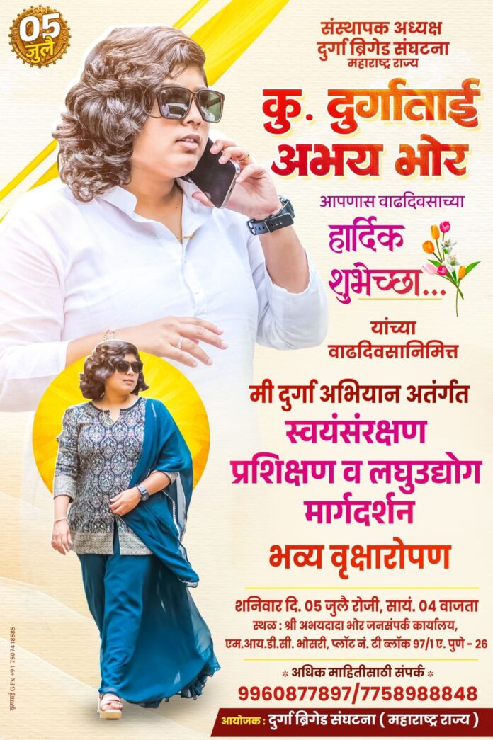 दुर्गा ब्रिगेड संघटना, महाराष्ट्र राज्य यांच्या वतीने संस्थापक अध्यक्ष कु. दुर्गाताई भोर यांच्या वाढदिवसानिमित्त एक भव्य कार्यक्रमाचे आयोजन करण्यात आले आहे. या विशेष दिवशी “मी दुर्गा अभियान” अंतर्गत भव्य वृक्षारोपण, स्वयंरक्षण प्रशिक्षण तसेच लघुउद्योग मार्गदर्शन या उपक्रमांचे आयोजन करण्यात आले आहे.