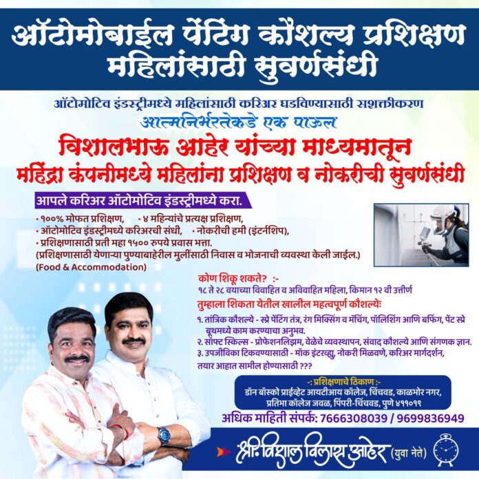 ऑटोमोटिव्ह इंडस्ट्रीजमध्ये महिलांसाठी करिअर घडविण्यासाठी तसेच महिलांचे सशक्तिकरण करण्यासाठी विशाल आहेर यांच्या माध्यमातून महिंद्रा कंपनीमध्ये महिलांना प्रशिक्षण नोकरीची सुवर्णसंधी उपलब्ध होणार आहे. हे प्रशिक्षण शंभर टक्के मोफत असून चार महिन्यांचे प्रत्यक्ष प्रशिक्षण यामध्ये देण्यात येणार आहे. इंडस्ट्रीज मध्ये करिअर करण्याची संधी या निमित्ताने महिलांसाठी उपलब्ध झाली आहे.
