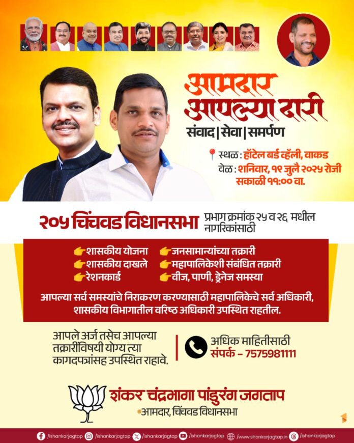 चिंचवड विधानसभा मतदारसंघाचे आमदार शंकर जगताप यांच्या पुढाकाराने “आमदार आपल्या दारी” हा उपक्रम राबवण्यात येत आहे. या अंतर्गत चिंचवड मतदारसंघातील वाकड भागातील नागरिकांच्या समस्या थेट आमदारांच्या उपस्थितीत आणि विविध शासकीय अधिकाऱ्यांच्या समवेत ऐकल्या जाणार आहेत.