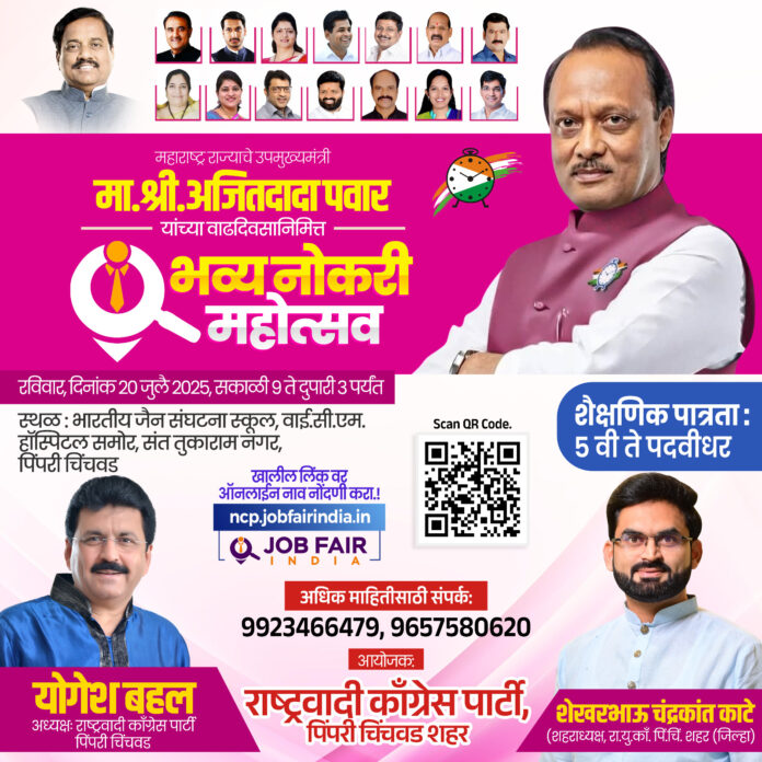 महाराष्ट्र राज्याचे उपमुख्यमंत्री तथा पुणे व बीड जिल्ह्याचे पालकमंत्री व राष्ट्रवादी पक्षाचे राष्ट्रीय अध्यक्ष अजित पवार यांच्या वाढदिवसानिमित्त पिंपरी चिंचवड शहरात राष्ट्रवादी पक्षाच्या वतीने भव्य नोकरी महोत्सवाचे आयोजन करण्यात आले आहे.