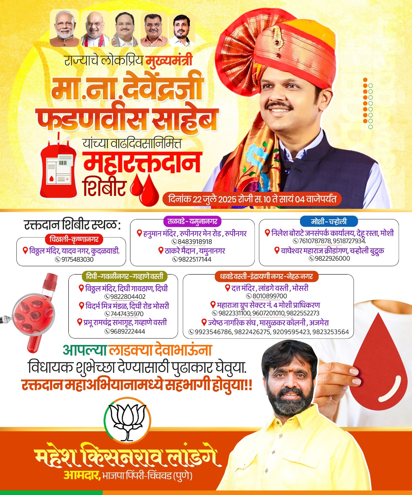 राज्याचे लोकप्रिय मुख्यमंत्री देवेंद्र फडणवीस यांच्या वाढदिवसानिमित्त महा रक्तदान शिबीर दि. 22 जुलै 2025 रोजी पिंपरी-चिंचवड शहरामध्ये विविध ठिकाणी आयोजित करण्यात आले आहे. मुख्यमंत्र्यांच्या वाढदिवसानिमित्त रक्तदानाचा संकल्प करून विधायक उपक्रमाचा आदर्श नागरिकांपुढे ठेवण्याचा प्रयत्न असल्याचे आमदार महेश लांडगे यांनी या निमित्ताने सांगितले.
