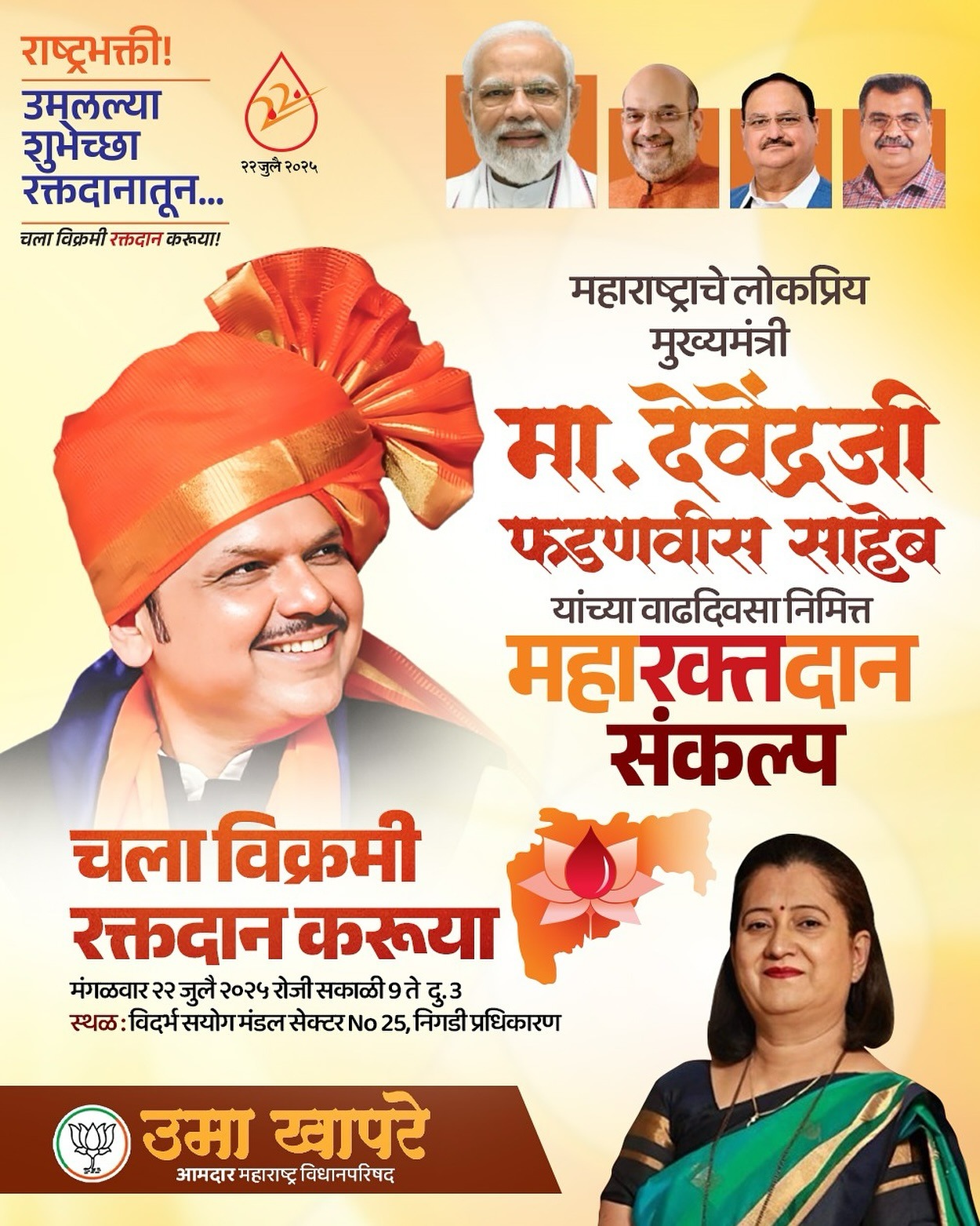 महाराष्ट्र राज्याचे मुख्यमंत्री देवेंद्र फडणवीस यांच्या वाढदिवसानिमित्त पिंपरी चिंचवड शहरातील विधान परिषदेच्या आमदार उमा खापरे यांच्या वतीने ‘महा रक्तदान संकल्प’ या शीर्षकांतर्गत भव्य रक्तदान शिबिराचे आयोजन करण्यात आले आहे.