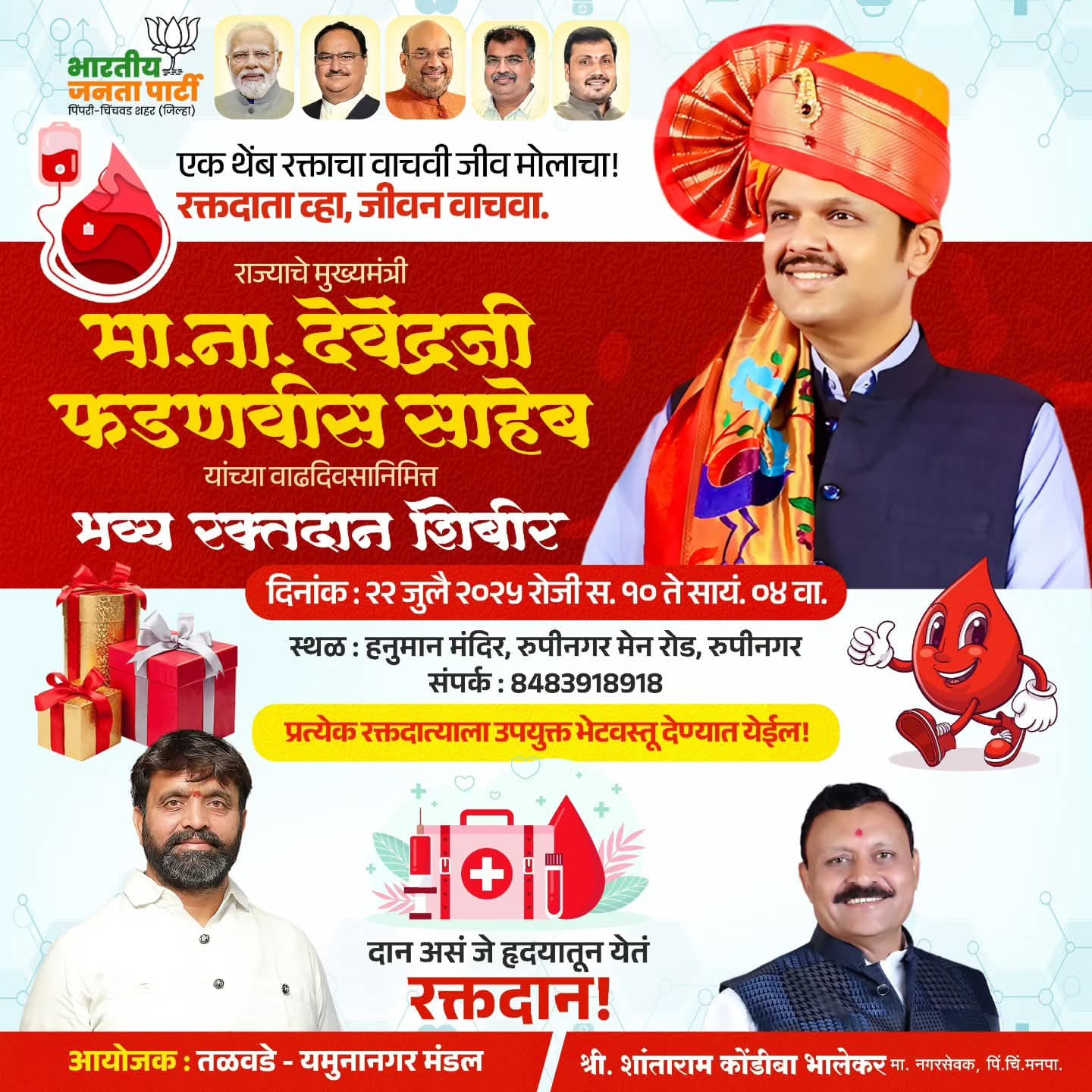 ‘एक थेंब रक्ताचा, वाचवी जिव मोलाचा’, या शीर्षकांतर्गत महाराष्ट्र राज्याचे मुख्यमंत्री देवेंद्र फडणवीस यांच्या वाढदिवसानिमित्त पिंपरी चिंचवड शहरात भव्य रक्तदान शिबिराचे आयोजन करण्यात आले आहे.