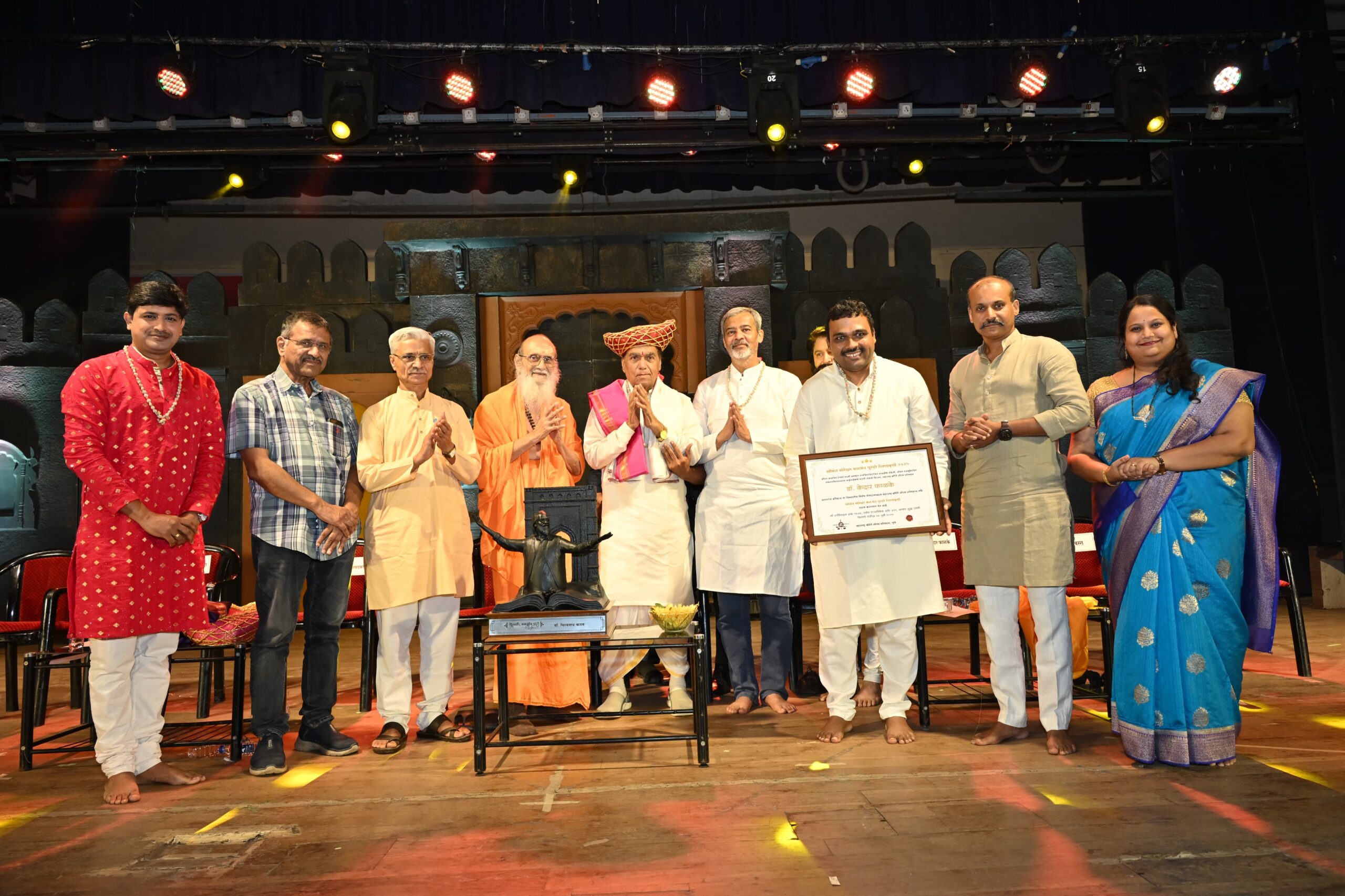 विज्ञान आणि अध्यात्म यांची सांगड घालून देशभरात विद्येचे प्रसारक कार्य हाती घेतलेले एमआयटीचे कुलपती डॉ. विश्वनाथ कराड यांना महाराष्ट्र कीर्ती सौरभ प्रतिष्ठानच्या वतीने चौथा “शिवशाहीर बाबासाहेब पुरंदरे पुरस्कार” स्वामीजींच्या हस्ते प्रदान करण्यात आला. त्याच प्रमाणे तरुण वयात इतिहास संशोधनाचा बाबासाहेबांचा वसा समर्थपणे पुढे चालवणारे डॉ. केदार फाळके यांना आदरणीय बाबासाहेबांच्या वडिलांच्या नावे दिली जाणारी “श्रीमंत मोरेश्वर बळवंत पुरंदरे शिष्यवृत्ती” प्रदान करण्यात आली. राष्ट्रीय स्वयंसेवक संघ पुणे महानगरचे संघचालक रवींद्र वंजारवाडकर यांच्या अध्यक्षतेखाली झालेल्या या कार्यक्रमात बाबासाहेबांचे पुत्र अमृत पुरंदरे, भारत इतिहास संशोधक मंडळाचे अध्यक्ष प्रदीप रावत, अभिषेक जाधव, विशाल सातव यांच्यासह अन्य मान्यवर उपस्थित होते.