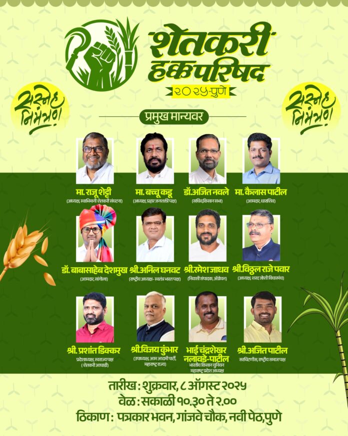 पुणे: शेतकरी, शेतमजूर यांच्या प्रश्नांना वाचा फोडावी, शेतकऱ्यांना सरसकट कर्जमाफी व शेतीमालाला योग्य हमीभाव मिळावा, या मागणीसाठी राज्यातील शेतकरी नेत्यांनी एकत्रित येत शेतकरी हक्क परिषदेचे पुण्यात आयोजन केले आहे. ही शेतकरी हक्क परिषद येत्या शुक्रवारी (ता. ८) रोजी सकाळी १०.३० वाजता नवी पेठेतील पत्रकार भवनात होणार आहे, अशी माहिती शेतकरी हक्क परिषदेचे संयोजक महेश बडे यांनी दिली.