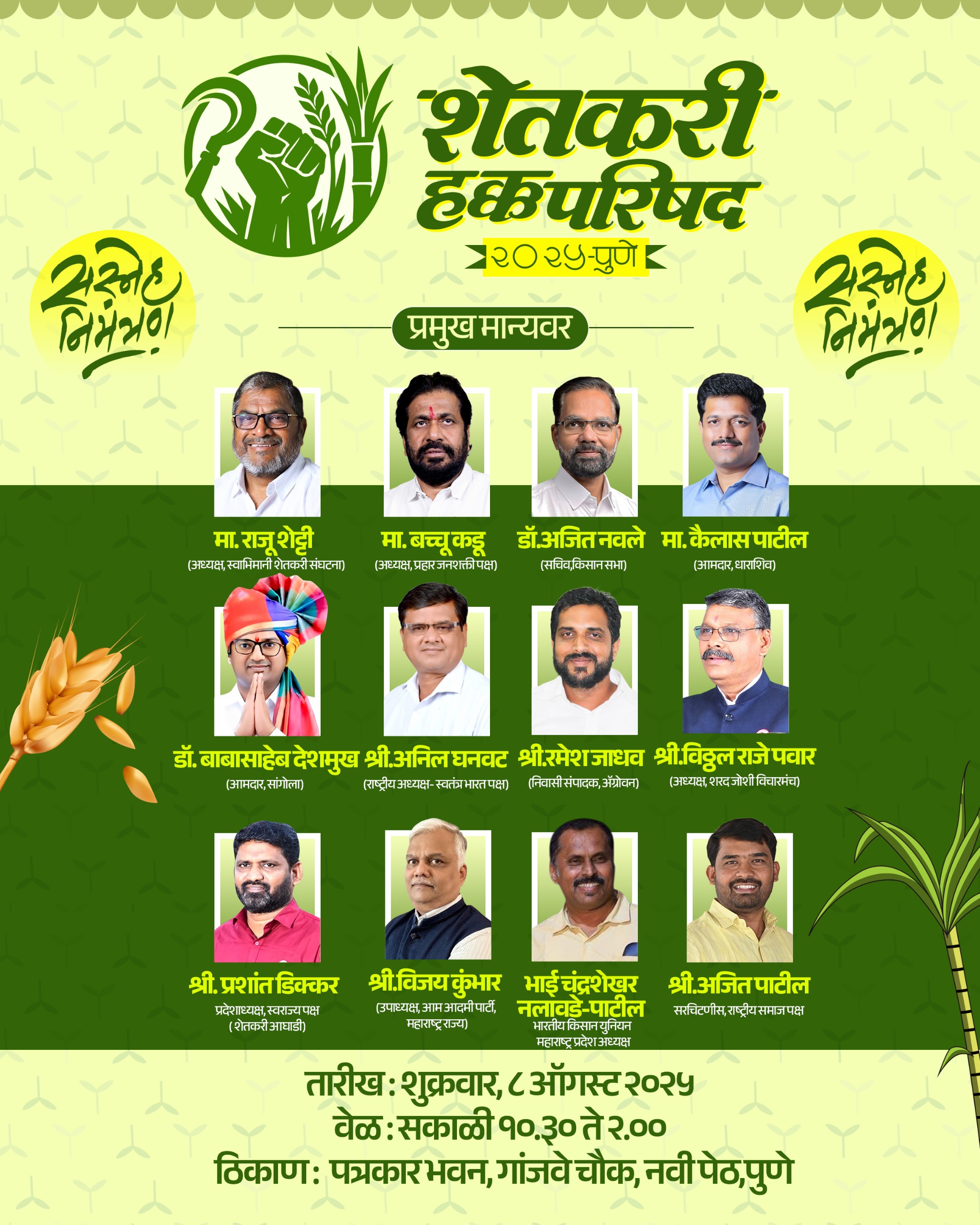 महेश बडे म्हणाले, “या परिषदेला स्वाभिमानी शेतकरी संघटनेचे अध्यक्ष व माजी खासदार राजू शेट्टी, प्रहार जनशक्ती पक्षाचे अध्यक्ष व माजी राज्यमंत्री बच्चू कडू, शेतकरी नेते व अखिल भारतीय किसानसभेचे राष्ट्रीय सहसचिव अजित नवले, शिवसेनेचे (उद्धव बाळासाहेब ठाकरे) आमदार कैलास पाटील, शेतकरी कामगार पक्षाचे आमदार डॉ. बाबासाहेब देशमुख, स्वतंत्र भारत पक्षाचे राष्ट्रीय अध्यक्ष अनिल घनवट, ज्येष्ठ पत्रकार रमेश जाधव, शरद जोशी विचारमंचाचे अध्यक्ष विठ्ठलराजे पवार, स्वराज्य पक्ष शेतकरी आघाडीचे प्रदेशाध्यक्ष प्रशांत डिक्कर, आम आदमी पार्टीचे उपाध्यक्ष विजय कुंभार, भारतीय किसान युनियनचे प्रदेशाध्यक्ष चंद्रशेखर नलावडे-पाटील, राष्ट्रीय समाज पक्षाचे सरचिटणीस अजित पाटील प्रमुख मार्गदर्शक म्हणून उपस्थित राहणार आहेत.”