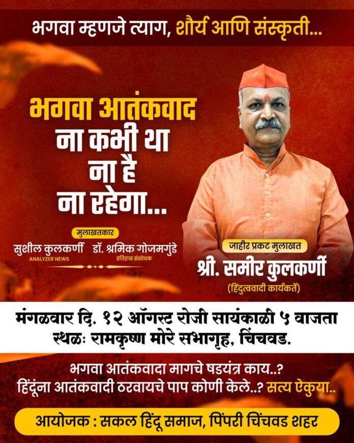 चिंचवड दि.१० (प्रतिनिधी) : भगवा कधीही आतंकवादाचं प्रतिक नव्हताच, भगवा म्हणजे त्याग, शौर्य आणि संस्कृतीचे प्रतीक असल्याचे वेळोवेळी अधोरेखित झाले आहे. मालेगाव बॉम्बस्फोट प्रकरणी सर्व निरपराध हिंदुत्ववादी कार्यकर्त्यांची माननीय न्यायालयाने नुकतीच निर्दोष मुक्तता केल्यानंतर पुन्हा एकदा यावर शिक्कामोर्तब झाले. १७ वर्षाच्या न्यायालयातील या प्रदीर्घ लढाईनंतर खोट्या आरोपांखाली ज्या हिंदुत्ववादी कार्यकर्त्यांनी वर्षानुवर्षे तुरुंगवास भोगला त्यापैकी चिंचवड येथील समीर कुलकर्णी यांची देखील त्यांच्या सहकाऱ्यां समवेत निर्दोष मुक्तता झाली. या प्रकरणी तथाकथित भगवा आतंकवादामागचे षडयंत्र काय? हिंदूंना आतंकवादी ठरवायचे पाप कोणी केले? या संदर्भातील सत्य व गौप्यस्फोट समीर कुलकर्णी यांच्या प्रकट मुलाखतीतून समोर येणार आहे. मंगळवार दि.१२ ऑगस्ट रोजी चिंचवड येथील रामकृष्ण मोरे नाट्यगृहात सायंकाळी ५ वाजता जेष्ठ पत्रकार, विश्लेषक अॅनेलायझर न्यूजचे संपादक सुशील कुलकर्णी व इतिहास संशोधक डॉ.श्रमिक गोजमगुंडे समीर कुलकर्णी यांची प्रकट मुलाखत घेणार आहेत. या षडयंत्रामागील नेमके सत्य व निरपराध हिंदुत्ववादी कार्यकर्त्यांचा संघर्ष जाणून घेण्यासाठी सदर मुलाखत कार्यक्रमाला जास्तीत जास्त संख्येने उपस्थित राहण्याचे आवाहन आयोजक सकल हिंदू समाज पिंपरी चिंचवड चे वतीने करण्यात आले आहे.