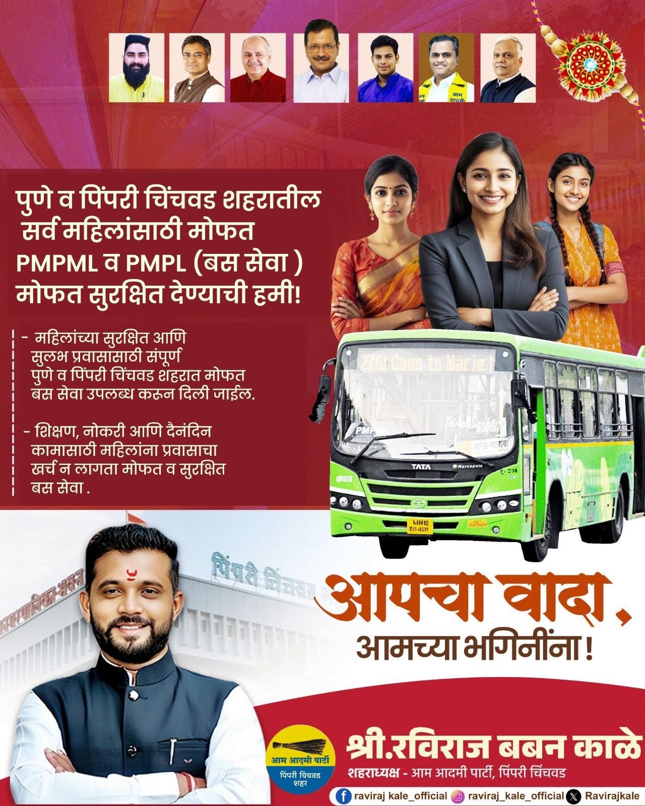 आम आदमी पार्टी पिंपरी-चिंचवडच्या वतीने शहरातील सर्व महिलांना सुरक्षित, सुलभ आणि मोफत प्रवासाची हमी देण्यात आली आहे. PMPML व PMPL बस सेवेद्वारे महिलांना शिक्षण, नोकरी तसेच दैनंदिन कामांसाठी मोफत व सुरक्षित प्रवासाची सुविधा उपलब्ध करून दिली जाणार आहे, असा दावा पिंपरी-चिंचवडचे शहराध्यक्ष श्री. रविराज काळे यांनी शहरातील सर्व भगिनींना केला आहे.