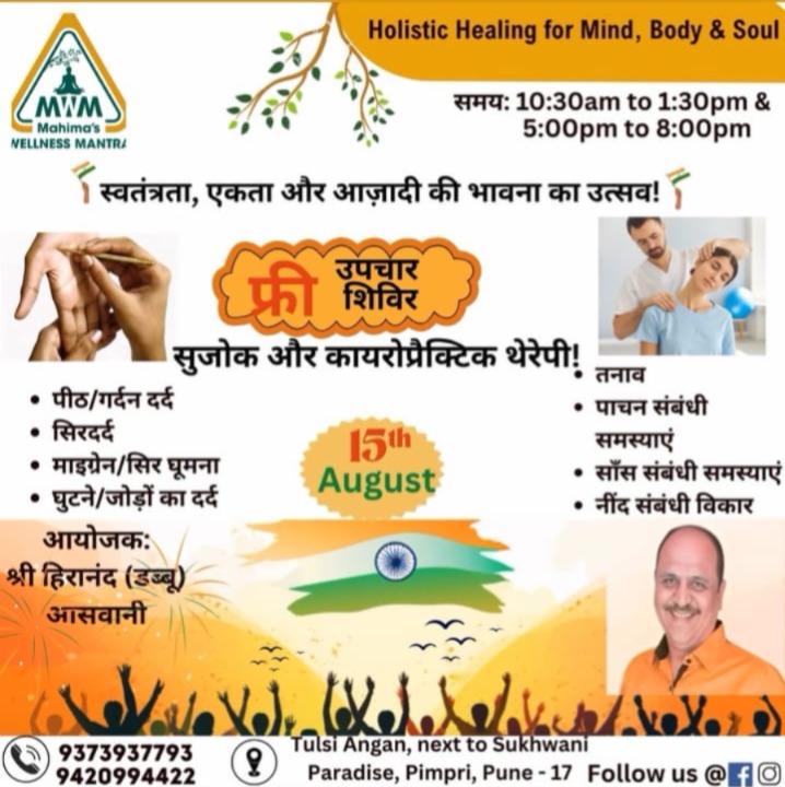 स्वतंत्रता दिवस के अवसर पर आयोजित इस स्वास्थ्य शिविर में सुजोक और काइरोप्रैक्टिक थेरेपी भी दी जाएगी। इस स्वास्थ्य शिविर में घुटने का दर्द, कमर दर्द, सिरदर्द, माइग्रेन, नींद न आना, सांस लेने में तकलीफ, पेट की बीमारी जैसी कई बीमारियों का इलाज किया जाएगा। हालाँकि, पूर्व उप-महापौर हीरानंद उर्फ डब्बा आसवानी ने अधिक से अधिक नागरिकों से इस निःशुल्क स्वास्थ्य शिविर का लाभ उठाने की अपील की है।